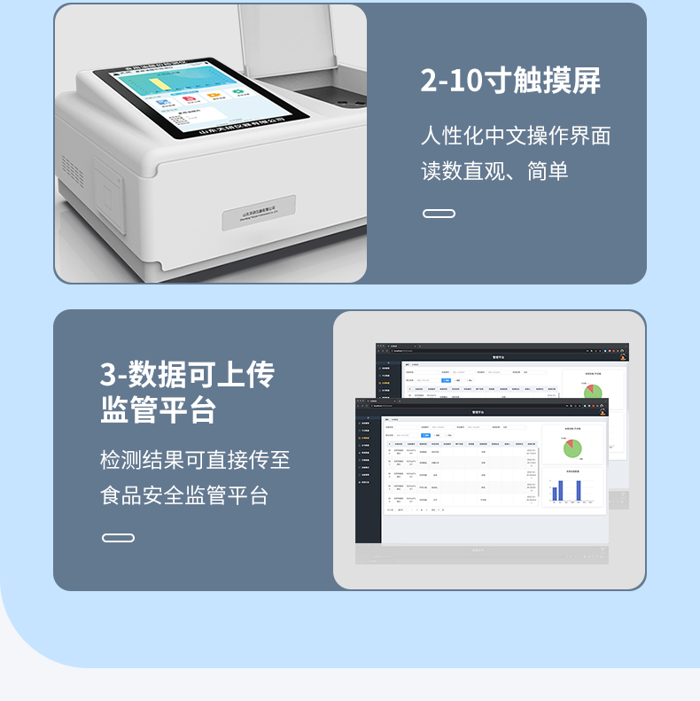 | 儀器采用臺(tái)式一體化系統(tǒng)檢測(cè)技術(shù),將分光光度模塊、新型農(nóng)殘檢測(cè)模塊、數(shù)字化管理模塊、無線通訊模塊高度集成于一體,支持檢測(cè)200種食品安全檢測(cè)項(xiàng)目,同時(shí)預(yù)留升級(jí)檢測(cè)方法。 | 儀器檢測(cè)模塊標(biāo)準(zhǔn)化、智能化,可隨意自由組合。檢測(cè)箱體內(nèi)置多個(gè)標(biāo)準(zhǔn)檢測(cè)單元,檢測(cè)模塊可以調(diào)整配置。 | 儀器采用全新安卓智能系統(tǒng),主控芯片采用 ARM Cortex-A7,RK3288/4核處理器,10.1寸高清液晶觸摸豎屏,更加**的UI交互界面,運(yùn)轉(zhuǎn)快捷;儀器配備無線通信模塊: 4G(APN)通訊模塊、Wifi模塊,藍(lán)牙傳輸,同時(shí)具有雙USB接口以及RJ45接口能以多種方式實(shí)現(xiàn)數(shù)據(jù)保存和數(shù)據(jù)傳輸功能。 | 創(chuàng)新檢測(cè)模式: | ★檢測(cè)通道:≥12通道;采用精密旋轉(zhuǎn)比色池設(shè)計(jì),使用同芯片同光源校準(zhǔn)精度,解決不同光源之間的誤差值。1-12通道間誤差0.1%。(**號(hào):ZL202022821055.2) | ★儀器具有自動(dòng)識(shí)別比色皿檢測(cè)功能,即:將樣品比色皿放入儀器后,點(diǎn)擊樣品檢測(cè),儀器自動(dòng)識(shí)別比色皿進(jìn)行通道檢測(cè)。 | 進(jìn)口高精光源: | 高精度進(jìn)口四波長冷光源,通道配置 410、520、590、630nm 波長光源,一個(gè)光源芯片驅(qū)動(dòng)一個(gè)光源,誤差極小,每臺(tái)設(shè)備單獨(dú)**校準(zhǔn)光源,**比對(duì),同時(shí)參照四種不同波段光源全方位覆蓋市面上99%的農(nóng)殘食品項(xiàng)目檢測(cè)。 | 智能化操作系統(tǒng): | 便捷操作系統(tǒng):設(shè)備檢測(cè)時(shí)可在同一檢測(cè)界面自動(dòng)對(duì)應(yīng)相關(guān)檢測(cè)通道一次性選擇1-12個(gè)樣品名稱,無須退出界面,節(jié)省操作時(shí)間。 | 數(shù)據(jù)集成系統(tǒng):設(shè)備首頁自動(dòng)統(tǒng)計(jì)檢測(cè)數(shù)據(jù)包含:周檢測(cè)數(shù)據(jù)、月檢測(cè)數(shù)據(jù),全部檢測(cè)總數(shù)量,均包含檢測(cè)總數(shù),合格數(shù),不合格數(shù),以及相關(guān)柱形分析圖,對(duì)各項(xiàng)檢測(cè)數(shù)據(jù)清晰掌握,無需電腦查詢,更加快捷直觀。 | 項(xiàng)目預(yù)設(shè)系統(tǒng):支持添加單個(gè)及多個(gè)相同或不相同的任務(wù)預(yù)設(shè),一鍵快速調(diào)取,每一個(gè)任務(wù)分別可以設(shè)置不同的樣品、批次、編號(hào)、來源、備注、抽樣信息、檢測(cè)信息、受檢信息、復(fù)核信息等更多信息。無縫鏈接平臺(tái)和APP實(shí)時(shí)查看下發(fā)任務(wù)。 | 數(shù)據(jù)監(jiān)管系統(tǒng):同步對(duì)接監(jiān)管平臺(tái),數(shù)據(jù)可局域網(wǎng)和互聯(lián)網(wǎng)數(shù)據(jù)上傳,檢測(cè)結(jié)果可選擇直接傳至食品安全監(jiān)管平臺(tái)。集成OSS輸出存儲(chǔ)服務(wù)、區(qū)分設(shè)備定向管理應(yīng)用,進(jìn)行區(qū)域食品安全監(jiān)管及大數(shù)據(jù)分析處理與數(shù)據(jù)統(tǒng)計(jì),檢測(cè)區(qū)域食品安全長短期動(dòng)態(tài),達(dá)到食品安全問題預(yù)估、預(yù)警。 | 自定義打印系統(tǒng):內(nèi)置全新打印系統(tǒng),新創(chuàng)自定義打印方式,可按需靈活設(shè)置開啟或關(guān)閉:產(chǎn)品合格證(國家農(nóng)業(yè)部標(biāo)準(zhǔn)要求),二維碼,抽樣信息、檢測(cè)信息,受檢信息、復(fù)核信息、抽樣日期、檢測(cè)日期等信息的打印。 | 系統(tǒng)遠(yuǎn)程更新功能:可定向分客戶分儀器更新系統(tǒng),按照不同客戶后期實(shí)際需求添加項(xiàng)目,無需機(jī)器返廠,即可遠(yuǎn)程實(shí)時(shí)升級(jí)全新系統(tǒng),節(jié)省時(shí)間成本及避免運(yùn)輸造成設(shè)備損壞。 | 儀器主機(jī)采用一體化防水、抗壓、防撞擊、防腐蝕箱體設(shè)計(jì),同時(shí)配備交直流供電,可連接車載電源,可選配大容量充電鋰電池,滿足現(xiàn)場(chǎng)野外檢測(cè)需求。 | 安全證書,放心保障:儀器具有中國計(jì)量科學(xué)研究院校準(zhǔn)證書,**認(rèn)證。 |