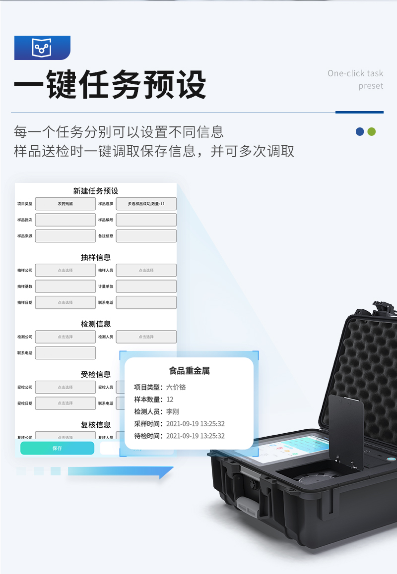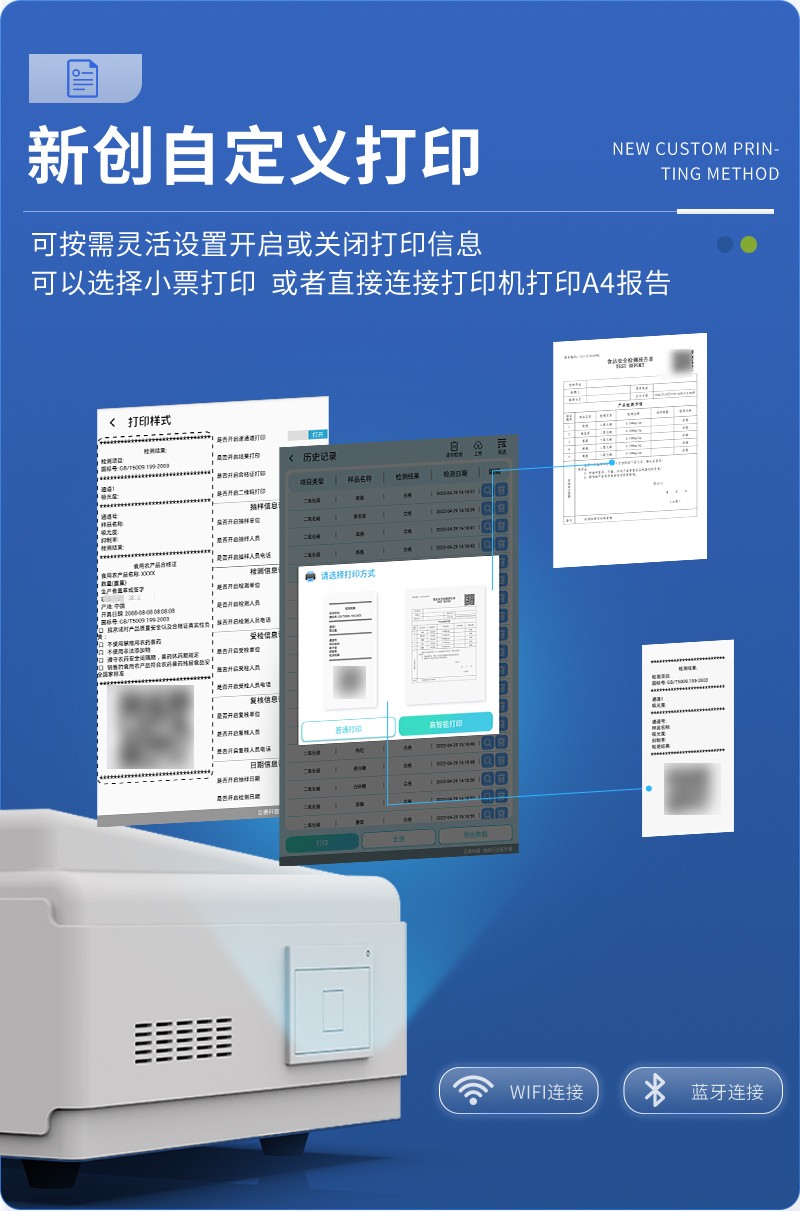 | 儀器采用臺(tái)式一體化系統(tǒng)檢測(cè)技術(shù),將分光光度模塊、數(shù)字化管理模塊、無(wú)線通訊模塊高度集成于一體,可支持檢測(cè)60種食品安全檢測(cè)項(xiàng)目,同時(shí)預(yù)留升級(jí)檢測(cè)方法。 | 儀器檢測(cè)模塊標(biāo)準(zhǔn)化、智能化,檢測(cè)項(xiàng)目可隨意自由組合。檢測(cè)箱體內(nèi)置多個(gè)標(biāo)準(zhǔn)檢測(cè)單元,檢測(cè)模塊可以調(diào)整配置。 | 儀器采用全新安卓智能系統(tǒng),主控芯片采用 ARM Cortex-A7,RK3288/4核處理器,10.1寸高清液晶觸摸豎屏,更加**的UI交互界面,運(yùn)轉(zhuǎn)快捷;儀器配備無(wú)線通信模塊: 4G(APN)通訊模塊、Wifi模塊,藍(lán)牙傳輸,同時(shí)具有雙USB接口以及RJ45接口能以多種方式實(shí)現(xiàn)數(shù)據(jù)保存和數(shù)據(jù)傳輸功能。 | 顯示屏幕:儀器采用10.1英寸豎向液晶觸摸屏顯,搭配運(yùn)行安卓智能操作系統(tǒng),主控芯片采用ARM Cortex-A7,RK3288/4核處理器,主頻1.88Ghz,操作方便,性能更強(qiáng)。 | 檢測(cè)通道:≥12通道;采用精密旋轉(zhuǎn)比色池設(shè)計(jì),使用同芯片同光源校準(zhǔn)精度,解決不同光源之間的誤差值,更加準(zhǔn)確**。(1-12通道間誤差0.1%,**號(hào):ZL202022821055.2) | 儀器光源:高精度進(jìn)口四波長(zhǎng)冷光源,每個(gè)通道均配置 410、520、590、630nm 波長(zhǎng)光源,標(biāo)配**的光路切換裝置,**光路切換功能可實(shí)現(xiàn)64波長(zhǎng),并且所有檢測(cè)項(xiàng)目可實(shí)現(xiàn)所有通道同時(shí)檢測(cè)。 | 設(shè)備可一鍵校準(zhǔn),自動(dòng)保存校準(zhǔn)數(shù)據(jù),自動(dòng)對(duì)比校驗(yàn),得到精準(zhǔn)光源,采用Android SP存儲(chǔ)數(shù)據(jù),光源數(shù)據(jù)永不丟失,方便每一次使用。 | 通訊接口:配備無(wú)線通信模塊、4G(APN)通訊模塊、藍(lán)牙傳輸,同時(shí)具有雙USB接口以及RJ45網(wǎng)線接口,可以多方式實(shí)現(xiàn)數(shù)據(jù)保存及數(shù)據(jù)傳輸。 | 存儲(chǔ)方式:支持U盤(pán)存儲(chǔ),標(biāo)準(zhǔn)USB接口,免驅(qū)動(dòng)安裝。檢測(cè)結(jié)果存儲(chǔ)容量20萬(wàn)條以上,可生成Excel表格進(jìn)行拷貝,并具有登錄保護(hù)功能。 | 智能化操作系統(tǒng): | 1、操作系統(tǒng):儀器可在同一檢測(cè)界面自動(dòng)對(duì)應(yīng)相關(guān)檢測(cè)通道,一次性選擇1-12個(gè)樣品名稱,無(wú)需退出界面,節(jié)省操作時(shí)間。并可以對(duì)每個(gè)通道屬性和樣品信息單獨(dú)進(jìn)行編輯,例如送檢單位、人員,檢測(cè)人員等,打印時(shí)勾選打印顯示。 | 2、數(shù)據(jù)集成系統(tǒng):設(shè)備首頁(yè)自動(dòng)匯總分析檢測(cè)數(shù)據(jù),包含:周檢測(cè)數(shù)據(jù)、月檢測(cè)數(shù)據(jù),全部檢測(cè)總數(shù)量,均包含檢測(cè)總數(shù),合格數(shù),不合格數(shù),以及相關(guān)柱形分析圖,各項(xiàng)檢測(cè)數(shù)據(jù)一目了然,無(wú)需電腦查詢,更加快捷直觀。 | 3、數(shù)據(jù)庫(kù)系統(tǒng):十幾項(xiàng)數(shù)據(jù)庫(kù)分類管理儀器:包含項(xiàng)目類型、項(xiàng)目數(shù)據(jù)、檢測(cè)數(shù)據(jù)、歷史記錄、國(guó)標(biāo)信息、曲線信息、采樣信息、檢測(cè)信息、受檢信息、復(fù)核信息、圖表信息、光源校準(zhǔn)信息、打印樣式信息、樣品庫(kù)信息等等,數(shù)據(jù)庫(kù)之間互相協(xié)調(diào)聯(lián)動(dòng)保證數(shù)據(jù)的真實(shí)完整性。同時(shí)產(chǎn)品數(shù)據(jù)庫(kù)以及歷史檢測(cè)記錄支持一鍵檢索功能。 | 4、限量規(guī)判系統(tǒng):具有限量查詢、添加物質(zhì)合規(guī)判定系統(tǒng)。檢測(cè)出結(jié)果后,系統(tǒng)自動(dòng)調(diào)用系統(tǒng)數(shù)據(jù)庫(kù)中相關(guān)國(guó)標(biāo)進(jìn)行比對(duì)判定,客觀顯示判定結(jié)果是否合格。 | 5、項(xiàng)目預(yù)設(shè)系統(tǒng):儀器具有任務(wù)預(yù)設(shè)模塊,一鍵提前預(yù)設(shè),給出方便快捷的新檢測(cè)方案,每一個(gè)任務(wù)分別可以設(shè)置不同的樣品、批次、編號(hào)、來(lái)源、備注、抽樣信息、檢測(cè)信息、受檢信息、復(fù)核信息等更多信息。樣品送檢時(shí)一鍵調(diào)取保存信息,并可多次調(diào)取,大大提高檢測(cè)效率。 | 6、數(shù)據(jù)監(jiān)管系統(tǒng):同步對(duì)接監(jiān)管平臺(tái),數(shù)據(jù)可局域網(wǎng)和互聯(lián)網(wǎng)數(shù)據(jù)上傳,檢測(cè)結(jié)果可選擇直接傳至食品安全監(jiān)管平臺(tái)。進(jìn)行區(qū)域食品安全監(jiān)管及大數(shù)據(jù)分析處理與數(shù)據(jù)統(tǒng)計(jì),檢測(cè)區(qū)域食品安全長(zhǎng)短期動(dòng)態(tài),達(dá)到食品安全問(wèn)題預(yù)估、預(yù)警。 | 7、全新打印系統(tǒng):內(nèi)置全新打印機(jī),新創(chuàng)自定義打印方式,可按需靈活勾選控制:二維碼,抽樣信息、檢測(cè)信息,受檢信息、復(fù)核信息、抽樣日期、檢測(cè)日期等信息的打印。 | 8、A4紙版本報(bào)告打印功能(可選配):設(shè)備擁有兩種結(jié)果展示方式,可以自動(dòng)生成A4打印模板和小票打印模板兩種樣式,可通過(guò)WiFi及網(wǎng)線等方式鏈接外置打印機(jī)可進(jìn)行打印。 | 供電模式:儀器交直流兩用,直流12V供電,可連接車(chē)載電源,可配6ah大容量充電鋰電池,電量可實(shí)時(shí)顯示,方便戶