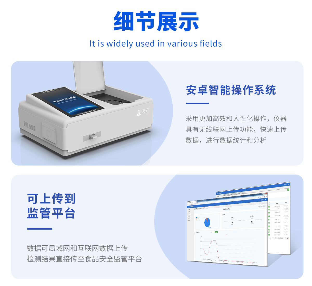 | 儀器采用臺式一體化系統(tǒng)檢測技術(shù),將分光光度模塊、膠體金檢測模塊、新型農(nóng)殘檢測模塊、數(shù)字化管理模塊、無線通訊模塊高度集成于一體,支持檢測200種食品安全檢測項(xiàng)目,同時預(yù)留升級檢測方法。 | 儀器檢測模塊標(biāo)準(zhǔn)化、智能化,可隨意自由組合。檢測箱體內(nèi)置多個標(biāo)準(zhǔn)檢測單元,檢測模塊可以調(diào)整配置。 | 儀器采用全新安卓智能系統(tǒng),主控芯片采用 ARM Cortex-A7,RK3288/4核處理器,10.1寸高清液晶觸摸豎屏,更加**的UI交互界面,運(yùn)轉(zhuǎn)快捷;儀器配備無線通信模塊: 4G(APN)通訊模塊、Wifi模塊,藍(lán)牙傳輸,同時具有雙USB接口以及RJ45接口能以多種方式實(shí)現(xiàn)數(shù)據(jù)保存和數(shù)據(jù)傳輸功能。 | 創(chuàng)新檢測模式: | ★檢測通道:≥12通道;采用精密旋轉(zhuǎn)比色池設(shè)計,使用同芯片同光源校準(zhǔn)精度,解決不同光源之間的誤差值。1-12通道間誤差0.1%。(**號:ZL202022821055.2) | ★儀器具有自動識別比色皿檢測功能,即:將樣品比色皿放入儀器后,點(diǎn)擊樣品檢測,儀器自動識別比色皿進(jìn)行通道檢測。 | 進(jìn)口高精光源: | 高精度進(jìn)口四波長冷光源,通道配置 410、520、590、630nm 波長光源,一個光源芯片驅(qū)動一個光源,誤差極小,每臺設(shè)備單獨(dú)**校準(zhǔn)光源,**比對,同時參照四種不同波段光源全方位覆蓋市面上99%的農(nóng)殘食品項(xiàng)目檢測。 | 膠體金模塊檢測方式: | 采用COMS實(shí)時成像技術(shù),可采集多個畫面,支持3個金標(biāo)同時讀卡,通過不同顏色的灰度變化,一秒精準(zhǔn)得出結(jié)果。 | 智能化操作系統(tǒng): | 便捷操作系統(tǒng):設(shè)備檢測時可在同一檢測界面自動對應(yīng)相關(guān)檢測通道一次性選擇1-12個樣品名稱,無須退出界面,節(jié)省操作時間。 | 數(shù)據(jù)集成系統(tǒng):設(shè)備首頁自動統(tǒng)計檢測數(shù)據(jù)包含:周檢測數(shù)據(jù)、月檢測數(shù)據(jù),全部檢測總數(shù)量,均包含檢測總數(shù),合格數(shù),不合格數(shù),以及相關(guān)柱形分析圖,對各項(xiàng)檢測數(shù)據(jù)清晰掌握,無需電腦查詢,更加快捷直觀。 | 項(xiàng)目預(yù)設(shè)系統(tǒng):支持添加單個及多個相同或不相同的任務(wù)預(yù)設(shè),一鍵快速調(diào)取,每一個任務(wù)分別可以設(shè)置不同的樣品、批次、編號、來源、備注、抽樣信息、檢測信息、受檢信息、復(fù)核信息等更多信息。無縫鏈接平臺和APP實(shí)時查看下發(fā)任務(wù)。 | 數(shù)據(jù)監(jiān)管系統(tǒng):同步對接監(jiān)管平臺,數(shù)據(jù)可局域網(wǎng)和互聯(lián)網(wǎng)數(shù)據(jù)上傳,檢測結(jié)果可選擇直接傳至食品安全監(jiān)管平臺。集成OSS輸出存儲服務(wù)、區(qū)分設(shè)備定向管理應(yīng)用,進(jìn)行區(qū)域食品安全監(jiān)管及大數(shù)據(jù)分析處理與數(shù)據(jù)統(tǒng)計,檢測區(qū)域食品安全長短期動態(tài),達(dá)到食品安全問題預(yù)估、預(yù)警。 | 自定義打印系統(tǒng):內(nèi)置全新打印系統(tǒng),新創(chuàng)自定義打印方式,可按需靈活設(shè)置開啟或關(guān)閉:產(chǎn)品合格證(國家農(nóng)業(yè)部標(biāo)準(zhǔn)要求),二維碼,抽樣信息、檢測信息,受檢信息、復(fù)核信息、抽樣日期、檢測日期等信息的打印。 | 系統(tǒng)遠(yuǎn)程更新功能:可定向分客戶分儀器更新系統(tǒng),按照不同客戶后期實(shí)際需求添加項(xiàng)目,無需機(jī)器返廠,即可遠(yuǎn)程實(shí)時升級全新系統(tǒng),節(jié)省時間成本及避免運(yùn)輸造成設(shè)備損壞。 | 儀器主機(jī)采用一體化防水、抗壓、防撞擊、防腐蝕箱體設(shè)計,同時配備交直流供電,可連接車載電源,可選配大容量充電鋰電池,滿足現(xiàn)場野外檢測需求。 | 安全證書,放心保障:儀器具有中國計量科學(xué)研究院校準(zhǔn)證書,**認(rèn)證。 |