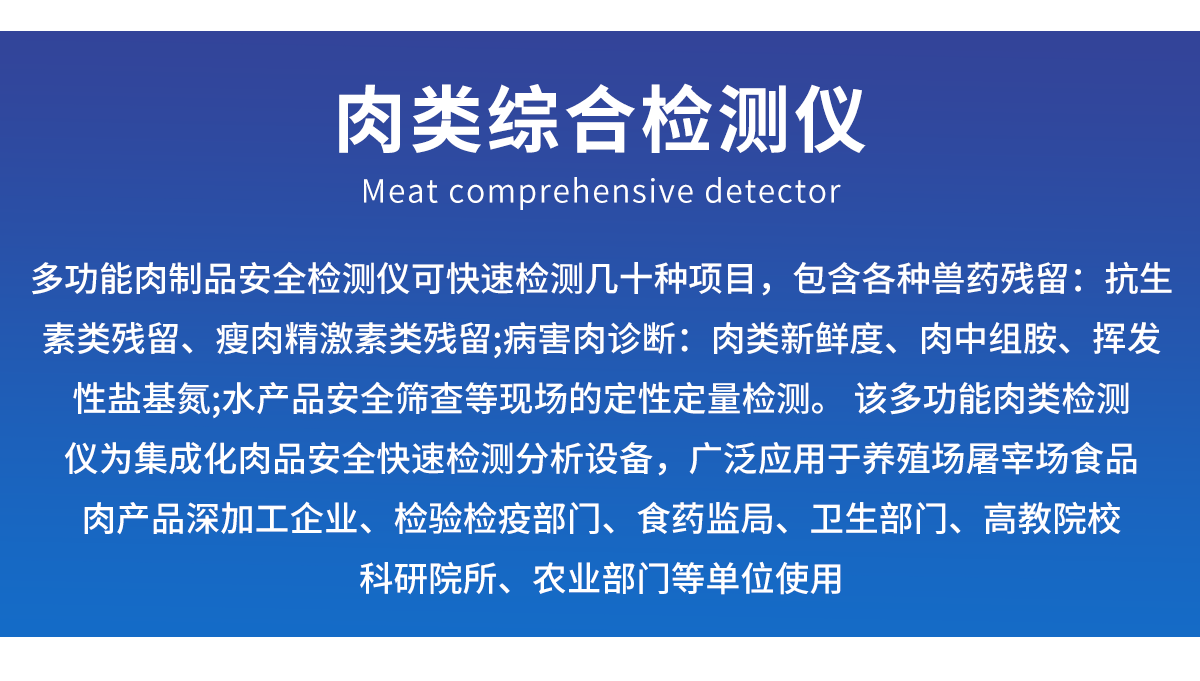 產(chǎn)品描述:產(chǎn)品介紹: 肉類綜合檢測儀可快速檢測幾十種項(xiàng)目,包含各種獸藥殘留:抗生素類殘留、瘦肉精激素類殘留;病害肉診斷:肉類新鮮度、肉中組胺、揮發(fā)性鹽基氮;水產(chǎn)品安全篩查等現(xiàn)場的定性定量檢測。 該肉類綜合檢測儀為集成化肉品安全快速檢測分析設(shè)備,廣泛應(yīng)用于養(yǎng)殖場、屠宰場、食品肉產(chǎn)品深加工企業(yè)【詳情】
