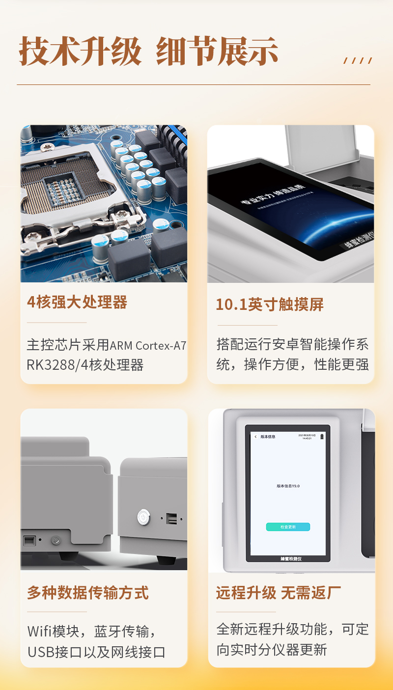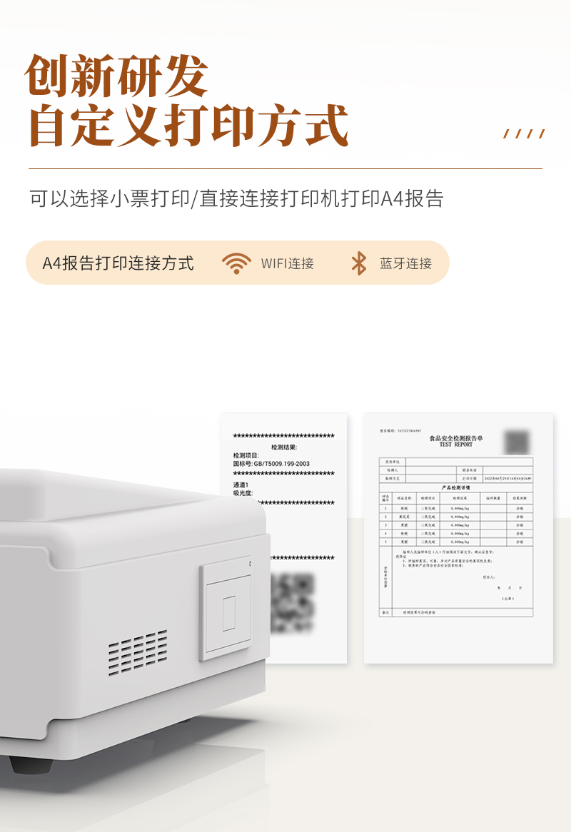 | 儀器采用臺式一體化系統(tǒng)檢測技術(shù),將分光光度模塊、數(shù)字化管理模塊、無線通訊模塊高度集成于一體,支持檢測200種食品安全檢測項(xiàng)目,同時(shí)預(yù)留升級檢測方法。 | 儀器檢測模塊標(biāo)準(zhǔn)化、智能化,檢測項(xiàng)目可隨意自由組合。檢測箱體內(nèi)置多個(gè)標(biāo)準(zhǔn)檢測單元,檢測模塊可以調(diào)整配置。 | 顯示屏幕:儀器采用10.1英寸豎向液晶觸摸屏顯,搭配運(yùn)行安卓智能操作系統(tǒng),主控芯片采用ARM Cortex-A7,RK3288/4核處理器,主頻1.88Ghz,操作方便,性能更強(qiáng)。 | 檢測通道:≥12通道;采用精密旋轉(zhuǎn)比色池設(shè)計(jì),使用同芯片同光源校準(zhǔn)精度,解決不同光源之間的誤差值,更加準(zhǔn)確**。(1-12通道間誤差0.1%,**號:ZL202022821055.2) | 儀器光源:高精度進(jìn)口四波長冷光源,每個(gè)通道均配置 410、520、590、630nm 波長光源,標(biāo)配**的光路切換裝置,**光路切換功能可實(shí)現(xiàn)64波長,并且所有檢測項(xiàng)目可實(shí)現(xiàn)所有通道同時(shí)檢測。 | 設(shè)備可一鍵校準(zhǔn),自動保存校準(zhǔn)數(shù)據(jù),自動對比校驗(yàn),得到精準(zhǔn)光源,采用Android SP存儲數(shù)據(jù),光源數(shù)據(jù)永不丟失,方便每一次使用。 | 通訊接口:配備無線通信模塊、可選配4G(APN)通訊模塊和藍(lán)牙傳輸,同時(shí)具有雙USB接口以及RJ45網(wǎng)線接口,可以多方式實(shí)現(xiàn)數(shù)據(jù)保存及數(shù)據(jù)傳輸。 | 存儲方式:支持U盤存儲,標(biāo)準(zhǔn)USB接口,免驅(qū)動安裝。檢測結(jié)果存儲容量20萬條以上,可生成Excel表格進(jìn)行拷貝,并具有登錄保護(hù)功能。 | 智能化操作系統(tǒng): | 1)操作系統(tǒng):儀器可在同一檢測界面自動對應(yīng)相關(guān)檢測通道,一次性選擇1-12個(gè)樣品名稱,無需退出界面,節(jié)省操作時(shí)間。并可以對每個(gè)通道屬性和樣品信息單獨(dú)進(jìn)行編輯,例如送檢單位、人員,檢測人員等,打印時(shí)勾選打印顯示。 | 2)數(shù)據(jù)集成系統(tǒng):設(shè)備首頁自動匯總分析檢測數(shù)據(jù),包含:周檢測數(shù)據(jù)、月檢測數(shù)據(jù),全部檢測總數(shù)量,均包含檢測總數(shù),合格數(shù),不合格數(shù),以及相關(guān)柱形分析圖,各項(xiàng)檢測數(shù)據(jù)一目了然,無需電腦查詢,更加快捷直觀。 | 3)數(shù)據(jù)庫系統(tǒng):十幾項(xiàng)數(shù)據(jù)庫分類管理儀器:包含項(xiàng)目類型、項(xiàng)目數(shù)據(jù)、檢測數(shù)據(jù)、歷史記錄、國標(biāo)信息、曲線信息、采樣信息、檢測信息、受檢信息、復(fù)核信息、圖表信息、光源校準(zhǔn)信息、打印樣式信息、樣品庫信息等等,數(shù)據(jù)庫之間互相協(xié)調(diào)聯(lián)動保證數(shù)據(jù)的真實(shí)完整性。同時(shí)產(chǎn)品數(shù)據(jù)庫以及歷史檢測記錄支持一鍵檢索功能。 | 4)限量規(guī)判系統(tǒng):具有限量查詢、添加物質(zhì)合規(guī)判定系統(tǒng)。檢測出結(jié)果后,系統(tǒng)自動調(diào)用系統(tǒng)數(shù)據(jù)庫中相關(guān)國標(biāo)進(jìn)行比對判定,客觀顯示判定結(jié)果是否合格。 | 5)項(xiàng)目預(yù)設(shè)系統(tǒng):儀器具有任務(wù)預(yù)設(shè)模塊,一鍵提前預(yù)設(shè),給出方便快捷的新檢測方案,每一個(gè)任務(wù)分別可以設(shè)置不同的樣品、批次、編號、來源、備注、抽樣信息、檢測信息、受檢信息、復(fù)核信息等更多信息。樣品送檢時(shí)一鍵調(diào)取保存信息,并可多次調(diào)取,大大提高檢測效率。 | 6)數(shù)據(jù)監(jiān)管系統(tǒng):同步對接監(jiān)管平臺,數(shù)據(jù)可局域網(wǎng)和互聯(lián)網(wǎng)數(shù)據(jù)上傳,檢測結(jié)果可選擇直接傳至食品安全監(jiān)管平臺。進(jìn)行區(qū)域食品安全監(jiān)管及大數(shù)據(jù)分析處理與數(shù)據(jù)統(tǒng)計(jì),檢測區(qū)域食品安全長短期動態(tài),達(dá)到食品安全問題預(yù)估、預(yù)警。 | 7)打印系統(tǒng):內(nèi)置全新打印機(jī),新創(chuàng)自定義打印方式,可按需靈活勾選控制:產(chǎn)品合格證(國家農(nóng)業(yè)部標(biāo)準(zhǔn)要求),二維碼,抽樣信息、檢測信息,受檢信息、復(fù)核信息、抽樣日期、檢測日期等信息的打印。 | 供電模式:儀器交直流兩用,直流12V供電,可連接車載電源,可配6ah大容量充電鋰電池,電量可實(shí)時(shí)顯示,方便戶外流動測試。 | 儀器加入遠(yuǎn)程升級功能,可定向分客戶分儀器更新,開機(jī)后自動更新,客戶無需任何操作,即可升級全新項(xiàng)目。做到了無需退換機(jī)器即可實(shí)現(xiàn)實(shí)時(shí)遠(yuǎn)程升級檢測儀器。 | 設(shè)備尺寸:(長*寬*高)440*300*180mm | 儀器加入遠(yuǎn)程升級功能,可定向分客戶分儀器更新,開機(jī)后自動更新,客戶無需任何操作,即可升級全新項(xiàng)目。做到了無需退換機(jī)器即可實(shí)現(xiàn)實(shí)時(shí)遠(yuǎn)程升級檢測儀器。 |