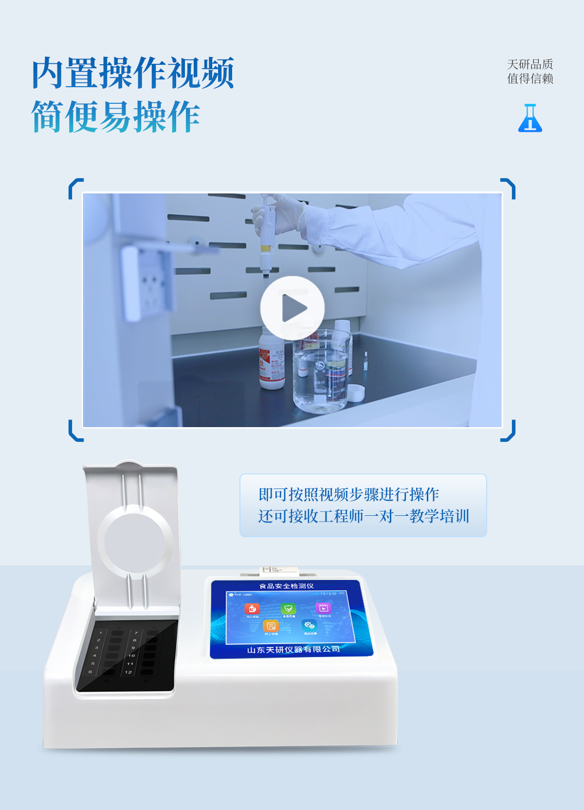 | 安卓智能操作系統(tǒng),采用更加**和人性化操作,儀器具有網(wǎng)線連接、wifi聯(lián)網(wǎng)上傳、GPRS無(wú)線遠(yuǎn)傳功能,快速上傳數(shù)據(jù)。 | 智能化程度高,儀器具有自檢功能:具有開(kāi)機(jī)自檢和調(diào)零功能,具有自動(dòng)檢測(cè)重復(fù)性功能。 | 檢測(cè)通道:≥12個(gè)檢測(cè)通道,可以同時(shí)測(cè)試多個(gè)樣品,每個(gè)樣品由程序控制分別獨(dú)立工作,不會(huì)互相干擾。 | 顯示方式:≥8英寸液晶觸摸屏顯示,人性化中文操作界面,讀數(shù)直觀、簡(jiǎn)單。 | 配備新一代嵌入式熱敏打印機(jī),可選擇手動(dòng)打印或者自動(dòng)打印,檢測(cè)完成可自動(dòng)打印檢測(cè)報(bào)告和二維碼。 | 光源采用進(jìn)口超高亮發(fā)光二極管,高精度、穩(wěn)定性強(qiáng)、光源可控、可以關(guān)掉不使用的光源,功耗更低。 | 采用USB2.0接口設(shè)計(jì),方便數(shù)據(jù)的存貯和移動(dòng),并可隨時(shí)與計(jì)算機(jī)直接相連,并且可用計(jì)算機(jī)控制儀器。實(shí)現(xiàn)數(shù)據(jù)查詢、瀏覽、分析、統(tǒng)計(jì)、打印等。 | 儀器帶有監(jiān)管平臺(tái)。數(shù)據(jù)可局域網(wǎng)和互聯(lián)網(wǎng)數(shù)據(jù)上傳,檢測(cè)結(jié)果直接傳至食品安全監(jiān)管平臺(tái)。進(jìn)行區(qū)域食品安全監(jiān)管及大數(shù)據(jù)分析處理,檢測(cè)區(qū)域食品安全長(zhǎng)短期動(dòng)態(tài),達(dá)到食品安全問(wèn)題預(yù)估、預(yù)警 | 一體化便攜式快檢設(shè)備,滿足現(xiàn)場(chǎng)及流動(dòng)檢測(cè)使用需求,能夠在同一軟件下實(shí)現(xiàn)所有檢測(cè)項(xiàng)目的檢測(cè),并可通過(guò)同一窗口直觀顯示檢測(cè)結(jié)果。 | 儀器具有多品類多種類樣品菜單庫(kù),可靈活選擇檢測(cè)樣品,不同的檢測(cè)通道可同時(shí)檢測(cè)不同的樣品項(xiàng)目。也可在儀器上直接編輯錄入樣品名稱、檢測(cè)指標(biāo)、送檢單位等信息并保存進(jìn)樣品數(shù)據(jù)庫(kù)。 | 樣品處理簡(jiǎn)單省力,整體操作快速、安全、便捷。 | 儀器具有自身保護(hù)功能,可設(shè)置用戶名及密碼,防止非工作人員操作等。 | 高靈敏度,高檢測(cè)精度,高重復(fù)性精度,掃描式高精度光學(xué)傳感器。 | 儀器具有重新校準(zhǔn)、鎖定、恢復(fù)出廠設(shè)置功能。 | 支持U盤(pán)存儲(chǔ)。 結(jié)果判定線可修改,對(duì)照值標(biāo)定值可保存,斷電不丟失數(shù)據(jù)。 |