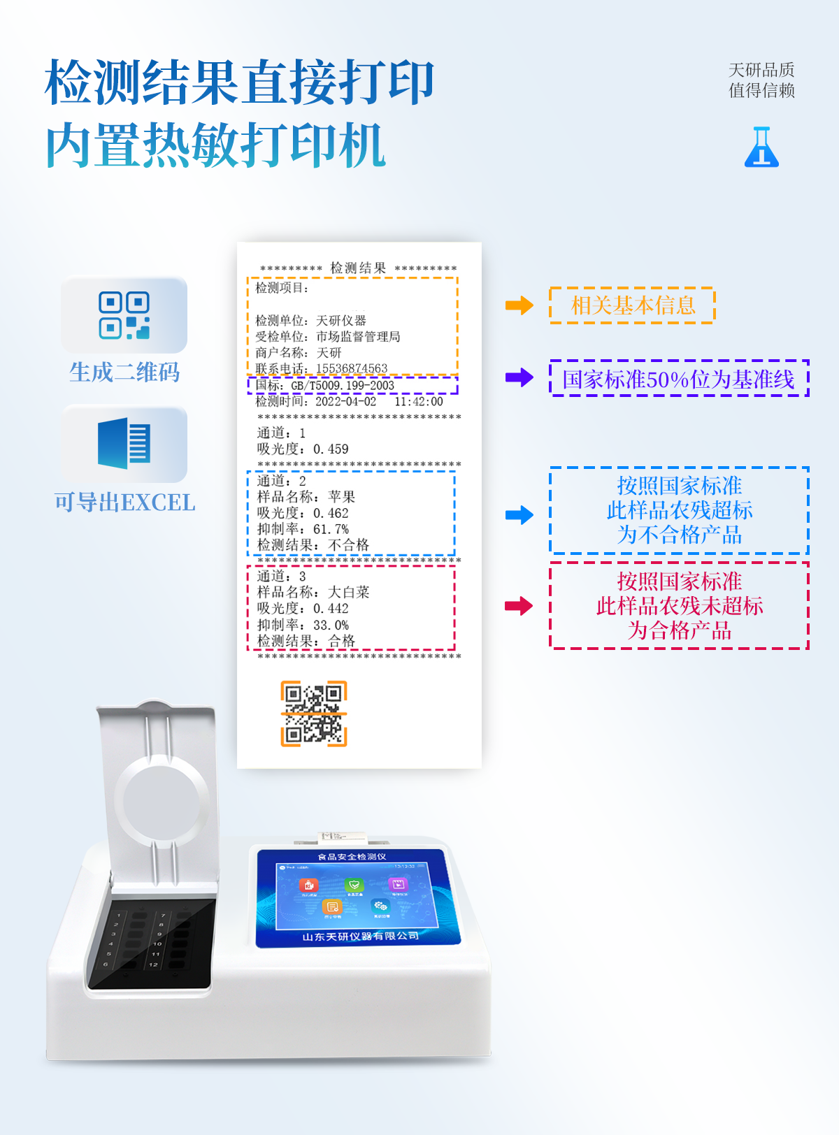 安卓智能操作系統(tǒng),采用更加**和人性化操作,儀器具有網(wǎng)線連接、wifi聯(lián)網(wǎng)上傳、GPRS無線遠傳功能,快速上傳數(shù)據(jù)。智能化程度高,儀器具有自檢功能:具有開機自檢和調零功能,具有自動檢測重復性功能。檢測通道:≥12個檢測通道,可以同時測試多個樣品,每個樣品由程序控制分別獨立工作,不會互相干擾。顯示方式:≥8英寸液晶觸摸屏顯示,人性化中文操作界面,讀數(shù)直觀、簡單。配備新一代嵌入式熱敏打印機,可選擇手動打印或者自動打印,檢測完成可自動打印檢測報告和二維碼。光源采用進口超高亮發(fā)光二極管,高精度、穩(wěn)定性強、光源可控、可以關掉不使用的光源,功耗更低。采用USB2.0接口設計,方便數(shù)據(jù)的存貯和移動,并可隨時與計算機直接相連,并且可用計算機控制儀器。實現(xiàn)數(shù)據(jù)查詢、瀏覽、分析、統(tǒng)計、打印等。儀器帶有監(jiān)管平臺。數(shù)據(jù)可局域網(wǎng)和互聯(lián)網(wǎng)數(shù)據(jù)上傳,檢測結果直接傳至食品安全監(jiān)管平臺。進行區(qū)域食品安全監(jiān)管及大數(shù)據(jù)分析處理,檢測區(qū)域食品安全長短期動態(tài),達到食品安全問題預估、預警一體化便攜式快檢設備,滿足現(xiàn)場及流動檢測使用需求,能夠在同一軟件下實現(xiàn)所有檢測項目的檢測,并可通過同一窗口直觀顯示檢測結果。儀器具有多品類多種類樣品菜單庫,可靈活選擇檢測樣品,不同的檢測通道可同時檢測不同的樣品項目。也可在儀器上直接編輯錄入樣品名稱、檢測指標、送檢單位等信息并保存進樣品數(shù)據(jù)庫。樣品處理簡單省力,整體操作快速、安全、便捷。儀器具有自身保護功能,可設置用戶名及密碼,防止非工作人員操作等。高靈敏度,高檢測精度,高重復性精度,掃描式高精度光學傳感器。儀器具有重新校準、鎖定、恢復出廠設置功能。支持U盤存儲。 結果判定線可修改,對照值標定值可保存,斷電不丟失數(shù)據(jù)。