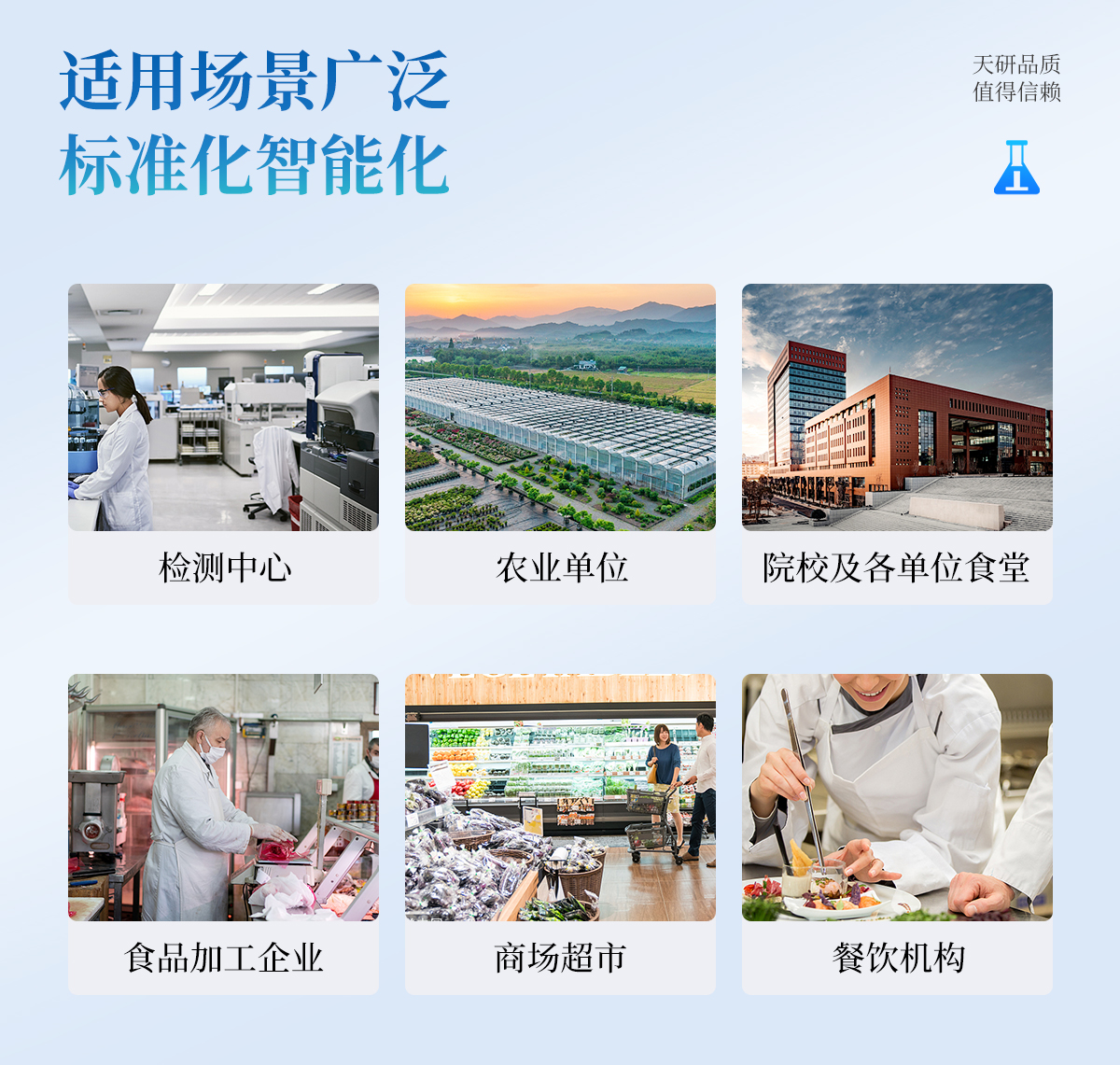 多功能食品安全檢測(cè)儀可快速檢測(cè)200多項(xiàng)目,包含非食用化學(xué)物質(zhì)、濫用食品添加劑、農(nóng)藥殘留、獸藥殘留、重金屬、病害肉、營(yíng)養(yǎng)強(qiáng)化劑、抗生素類殘留、激素類殘留、真菌毒素類殘留、化學(xué)類殘留等現(xiàn)場(chǎng)的定性定量檢測(cè)。該多功能食品安全檢測(cè)儀為集成化食品安全快速檢測(cè)分析設(shè)備,廣泛應(yīng)用于市場(chǎng)監(jiān)管局、檢測(cè)中心、衛(wèi)生監(jiān)督部門、農(nóng)業(yè)部門、院校及各單位食堂、食品肉產(chǎn)品深加工企業(yè)、商超市場(chǎng)、司法部門、餐飲機(jī)構(gòu)、養(yǎng)殖場(chǎng)、屠宰場(chǎng)、檢驗(yàn)檢疫部門等單位使用。