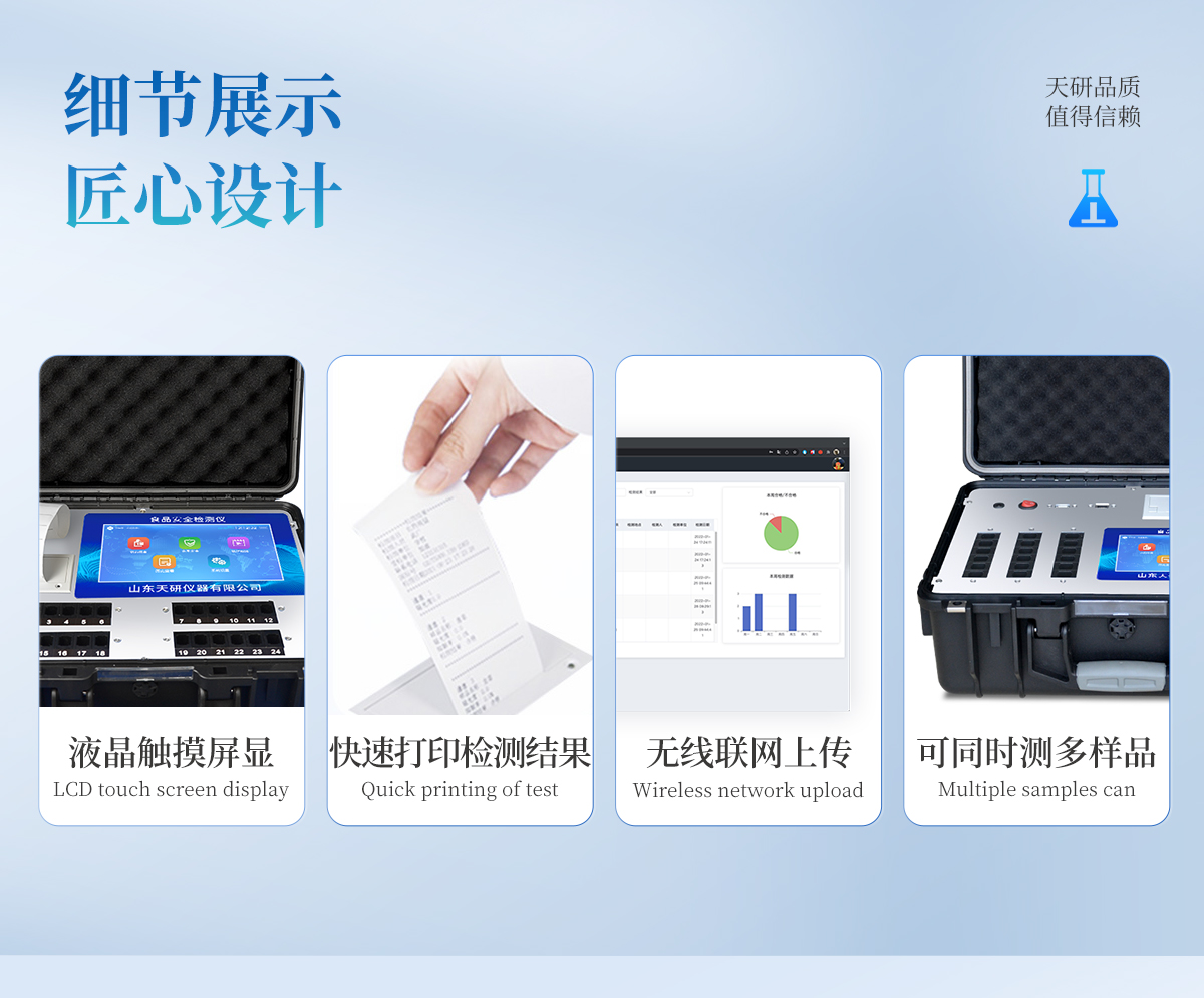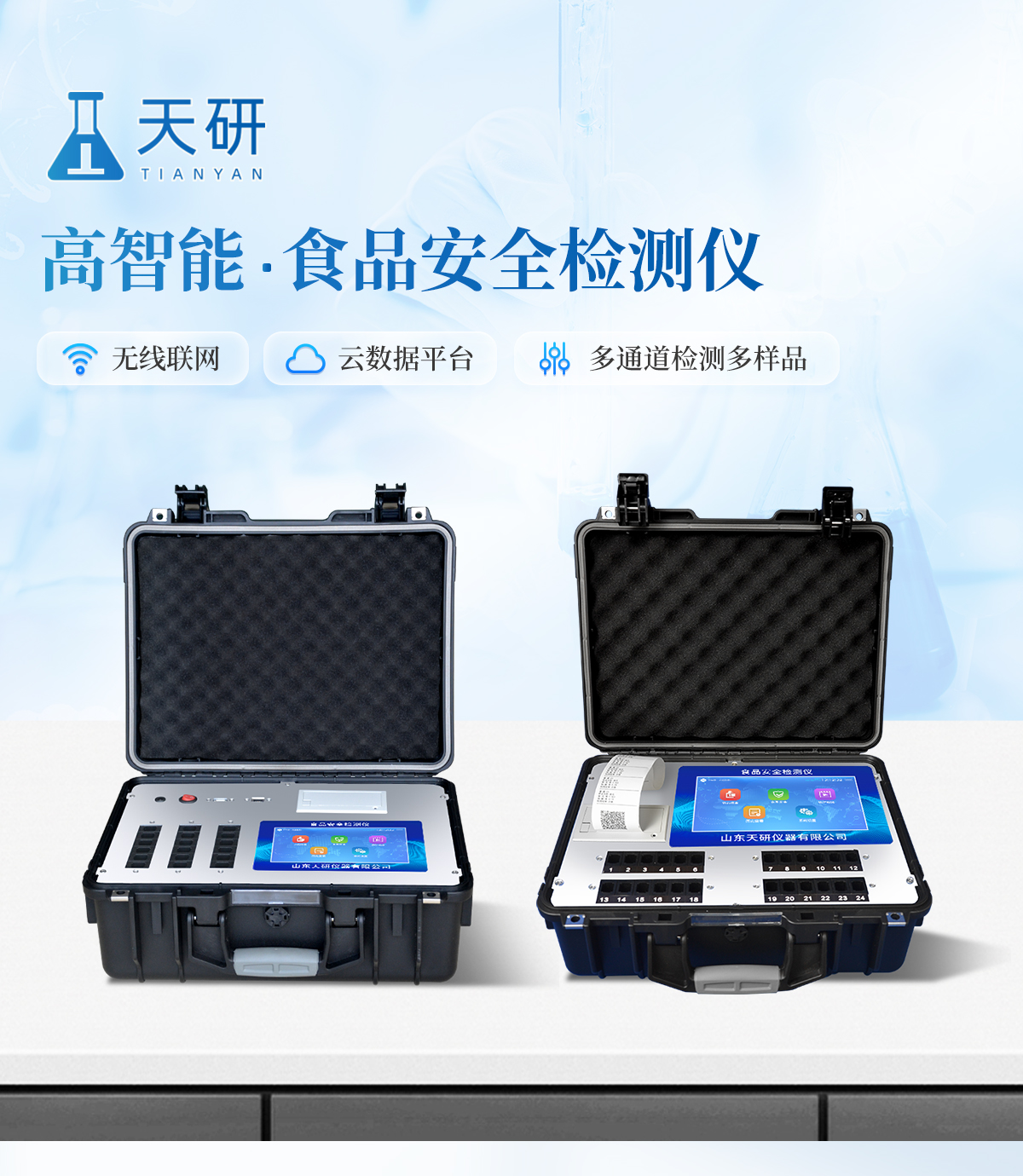 安卓智能操作系統(tǒng),采用更加**的UI交互界面,儀器具有wifi聯(lián)網(wǎng)上傳、4G聯(lián)網(wǎng)傳輸、GPRS無(wú)線遠(yuǎn)傳、網(wǎng)線連接功能,快速批量上傳數(shù)據(jù)。智能化程度高,儀器具有自檢功能:具有開(kāi)機(jī)自檢和調(diào)零功能,具有自動(dòng)檢測(cè)重復(fù)性功能。 新一代高速熱敏打印機(jī),檢測(cè)完成可自動(dòng)打印或批量打印檢測(cè)報(bào)告和二維碼。儀器帶有監(jiān)管平臺(tái),數(shù)據(jù)可局域網(wǎng)和互聯(lián)網(wǎng)數(shù)據(jù)上傳,檢測(cè)結(jié)果直接傳至食品安全監(jiān)管平臺(tái)。進(jìn)行區(qū)域食品安全監(jiān)管及大數(shù)據(jù)分析處理與數(shù)據(jù)統(tǒng)計(jì),檢測(cè)區(qū)域食品安全長(zhǎng)短期動(dòng)態(tài),達(dá)到食品安全問(wèn)題預(yù)估、預(yù)警一體化主機(jī),包含食品安全檢測(cè)模塊、多通道農(nóng)藥殘留檢測(cè)模塊、膠體金免疫層析檢測(cè)模塊。一體化便攜式快檢設(shè)備,滿足現(xiàn)場(chǎng)及流動(dòng)檢測(cè)使用需求,能夠在同一軟件下實(shí)現(xiàn)所有檢測(cè)項(xiàng)目的檢測(cè),并可通過(guò)同一窗口直觀顯示檢測(cè)結(jié)果。膠體金模塊檢測(cè)方式:軌道式自動(dòng)傳輸掃描,檢測(cè)完成后自動(dòng)退出檢測(cè)卡。 CT線自動(dòng)識(shí)別,無(wú)需手動(dòng)調(diào)整。 內(nèi)置強(qiáng)大的數(shù)據(jù)庫(kù),具有多品類多種類樣品菜單功能,可靈活選擇檢測(cè)樣品,不同的檢測(cè)通道可同時(shí)檢測(cè)不同的樣品項(xiàng)目。也可在儀器上直接編輯錄入樣品名稱、檢測(cè)指標(biāo)、送檢單位等信息并保存進(jìn)樣品數(shù)據(jù)庫(kù)。產(chǎn)品內(nèi)置操作演示視頻,是您身邊的化驗(yàn)指導(dǎo)專家。樣品處理簡(jiǎn)單省力,整體操作快速、安全、便捷。儀器具有自身保護(hù)功能,可設(shè)置用戶名及密碼,防止非工作人員操作等。高靈敏度,高檢測(cè)精度,高重復(fù)性精度,掃描式高精度光學(xué)傳感器。結(jié)果判定線可修改,對(duì)照值標(biāo)定值可保存,斷電不丟失數(shù)據(jù)。兼容市場(chǎng)上所有的膠體金卡,使用耗材不受限制,極大增強(qiáng)用戶使用體驗(yàn)。儀器具有重新校準(zhǔn)、鎖定、恢復(fù)出廠設(shè)置功能。