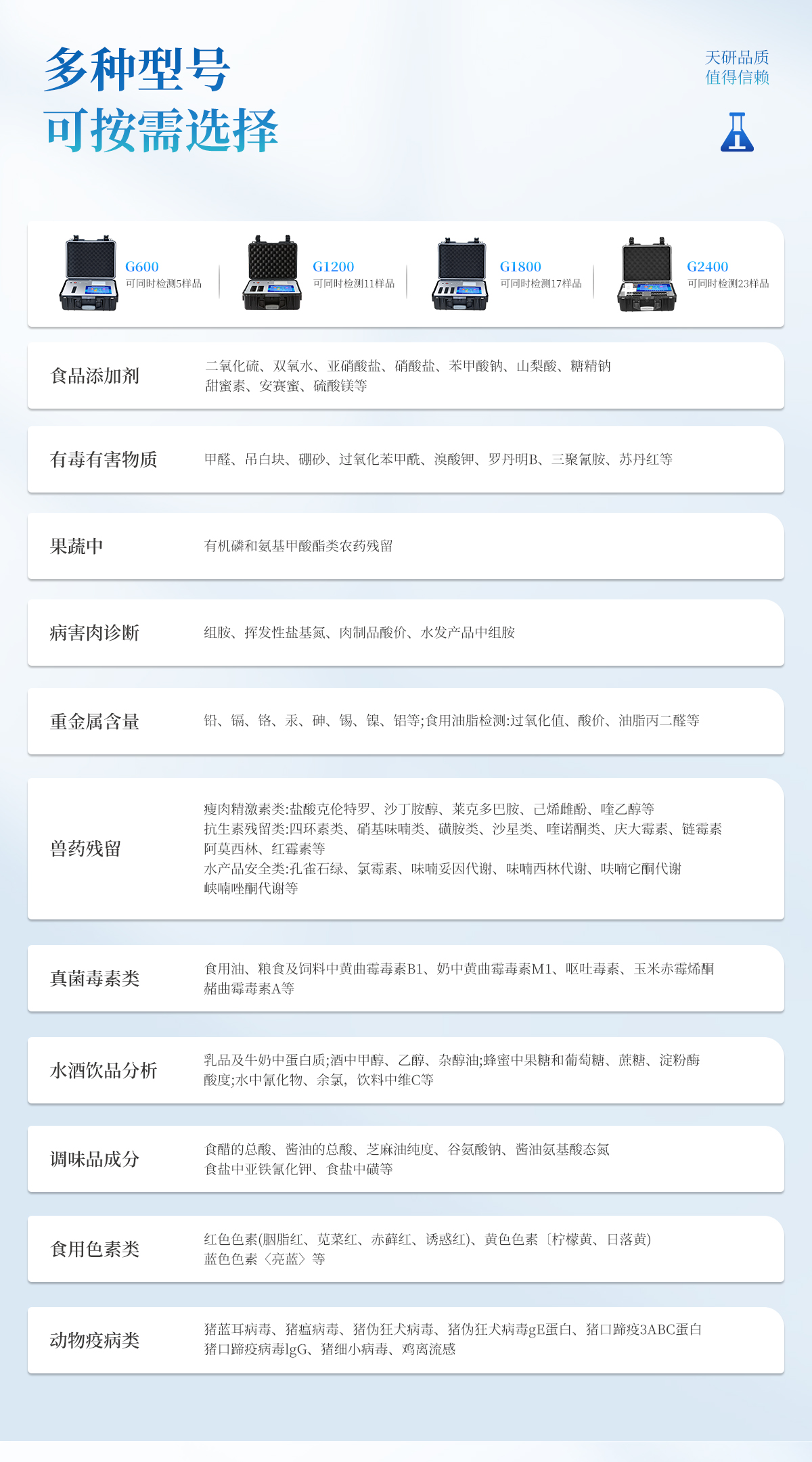 食品添加劑:二氧化硫、雙氧水、亞硝酸鹽、硝酸鹽、苯甲酸鈉、山梨酸、糖精鈉、甜蜜素、安賽蜜、硫酸鎂等有毒有害物質(zhì):甲醛、吊白塊、硼砂、過(guò)氧化苯甲酰、溴酸鉀、羅丹明B、三聚氰胺、蘇丹紅等果蔬中:有機(jī)磷和氨基甲酸酯類農(nóng)藥殘留;病害肉診斷:組胺、揮發(fā)性鹽基氮、肉制品酸價(jià)、水發(fā)產(chǎn)品中組胺重金屬含量:鉛、鎘、鉻、汞、砷、錫、鎳、鋁等;食用油脂檢測(cè):過(guò)氧化值、酸價(jià)、油脂丙二醛等。瘦肉精激素類(獸藥):鹽酸克倫特羅、沙丁胺醇、萊克多巴胺、己烯雌酚、喹乙醇等抗生素殘留類(獸藥):四環(huán)素類、硝基呋喃類、磺胺類、沙星類、喹諾酮類、慶大霉素、鏈霉素、阿莫西林、紅霉素等水產(chǎn)品安全類:孔雀石綠、氯霉素、呋喃妥因代謝、呋喃西林代謝、呋喃它酮代謝、呋喃唑酮代謝等真菌毒素類:食用油、糧食及飼料中黃曲霉毒素B1、奶中黃曲霉毒素M1、嘔吐毒素、玉米赤霉烯酮、赭曲霉毒素A等水酒飲品分析:乳品及牛奶中蛋白質(zhì);酒中甲醇、乙醇、雜醇油;蜂蜜中果糖和葡萄糖、蔗糖、淀粉酶、酸度;水中氰化物、余氯,飲料中維C等調(diào)味品成分:食醋的總酸、醬油的總酸、芝麻油純度、谷氨酸鈉、醬油氨基酸態(tài)氮、食鹽中亞鐵氰化鉀、食鹽中碘等食用色素類:紅色色素(胭脂紅、莧菜紅、赤蘚紅、誘惑紅)、黃色色素(檸檬黃、日落黃)、藍(lán)色色素(亮藍(lán))等動(dòng)物疫病類:豬藍(lán)耳病毒、豬瘟病毒、豬偽狂犬病毒、豬偽狂犬病毒gE蛋白、豬口蹄疫3ABC蛋白、豬口蹄疫病毒IgG、豬細(xì)小病毒、雞禽流感等