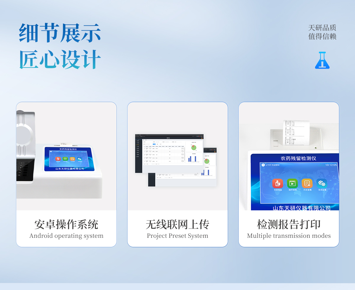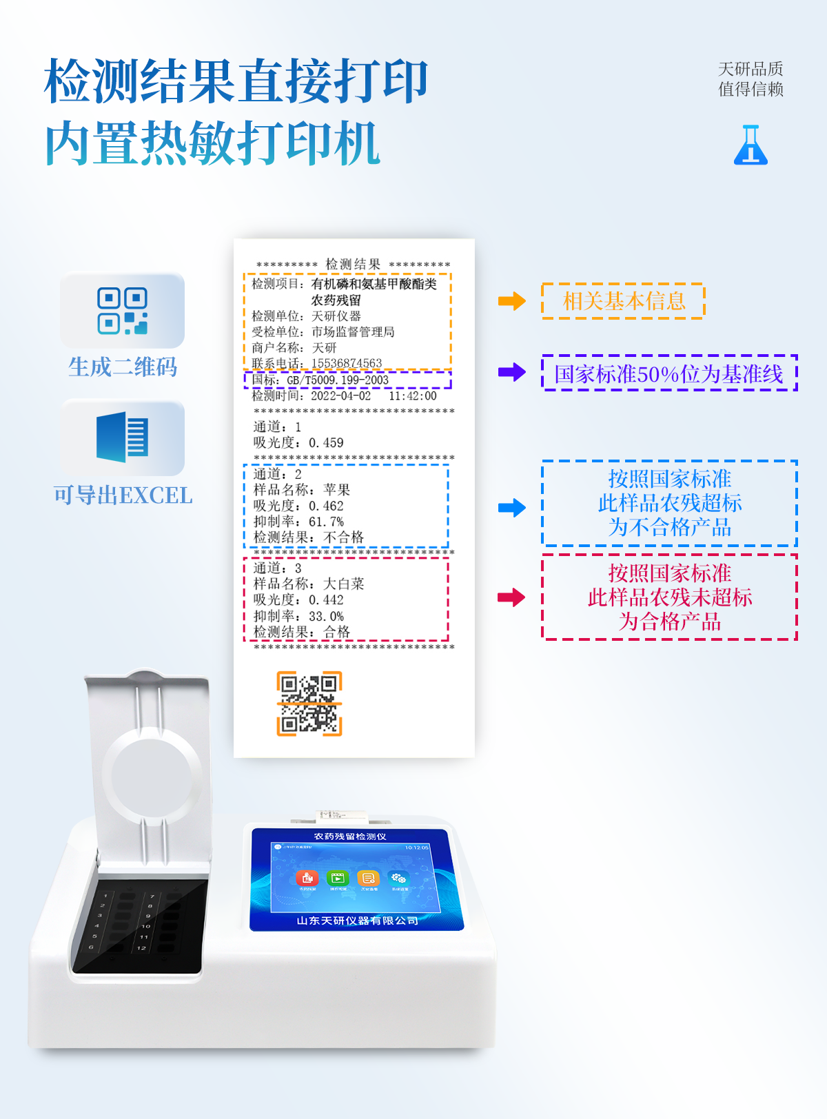 | 乙酰膽堿酯酶和丁酰膽堿酯酶試劑均可以使用,符合國(guó)家標(biāo)準(zhǔn)和農(nóng)業(yè)部標(biāo)準(zhǔn)的要求。 | 自動(dòng)判斷樣品是否合格,檢測(cè)結(jié)果更加直觀。 | 儀器具有100多種蔬菜名稱(chēng)菜單庫(kù),分類(lèi)管理,并可按需添加或刪除蔬菜名,編輯蔬菜名稱(chēng),可直接打印出蔬菜名稱(chēng)。 | 檢測(cè)通道:16個(gè)檢測(cè)通道,可以同時(shí)測(cè)試多個(gè)樣品,循環(huán)檢測(cè),即放即檢,每個(gè)樣品由程序控制分別獨(dú)立工作,不會(huì)互相干擾。 | 智能操作系統(tǒng),采用更加人性化操作,主控采用多核處理器,主頻1.88Ghz,運(yùn)轉(zhuǎn)速度更快速,穩(wěn)定性更強(qiáng)。 | 顯示方式:7英寸高靈敏真彩觸摸屏顯示,人性化中文操作界面,讀數(shù)直觀、簡(jiǎn)單。 | 打印機(jī)采用串口5v打印,可選擇手動(dòng)打印或者自動(dòng)打印,三分鐘出打印結(jié)果,打印格式為檢測(cè)人姓名、吸光度差值、檢測(cè)時(shí)間、檢測(cè)機(jī)構(gòu)、樣品名稱(chēng)及結(jié)果判定。 | 光源采用進(jìn)口超高亮發(fā)光二極管,具有低功耗、高精度、穩(wěn)定性強(qiáng)、光源可控可以關(guān)掉不使用的光源,響應(yīng)速度快等優(yōu)點(diǎn)。 | 智能恒流穩(wěn)壓,光強(qiáng)自動(dòng)校準(zhǔn),長(zhǎng)時(shí)間連續(xù)工作光源無(wú)溫漂現(xiàn)象。 | 儀器具有GPRS遠(yuǎn)傳功能,可插手機(jī)卡實(shí)現(xiàn)數(shù)據(jù)遠(yuǎn)傳平臺(tái),wifi聯(lián)網(wǎng)功能,可將數(shù)據(jù)快速上傳電腦,進(jìn)行數(shù)據(jù)管理與統(tǒng)計(jì)。 | 采用USB2.0接口設(shè)計(jì),方便數(shù)據(jù)的存貯和移動(dòng),并可隨時(shí)與計(jì)算機(jī)直接相連,并且可用計(jì)算機(jī)控制儀器。實(shí)現(xiàn)數(shù)據(jù)查詢(xún)、瀏覽、分析、統(tǒng)計(jì)、打印等。 | 智能化程度高,儀器具有自檢功能:具有開(kāi)機(jī)自檢和調(diào)零功能,具有自動(dòng)檢測(cè)重復(fù)性功能 | 儀器具有自身保護(hù)功能,可設(shè)置用戶(hù)名及密碼,防止非工作人員操作等。 | 采用DC12v直流供電,安全系統(tǒng)更高,并且配備6A鋰電池充電器。 | 儀器具有重新校準(zhǔn)、鎖定、恢復(fù)出廠設(shè)置功能。 |