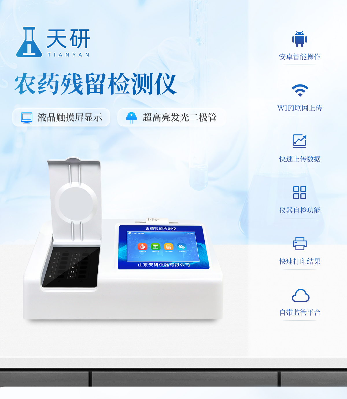 | 乙酰膽堿酯酶和丁酰膽堿酯酶試劑均可以使用,符合國家標(biāo)準(zhǔn)和農(nóng)業(yè)部標(biāo)準(zhǔn)的要求。 | 自動判斷樣品是否合格,檢測結(jié)果更加直觀。 | 儀器具有100多種蔬菜名稱菜單庫,分類管理,并可按需添加或刪除蔬菜名,編輯蔬菜名稱,可直接打印出蔬菜名稱。 | 檢測通道:24個檢測通道,可以同時測試多個樣品,循環(huán)檢測,即放即檢,每個樣品由程序控制分別獨(dú)立工作,不會互相干擾。 | 智能操作系統(tǒng),采用更加人性化操作,主控采用多核處理器,主頻1.88Ghz,運(yùn)轉(zhuǎn)速度更快速,穩(wěn)定性更強(qiáng)。 | 顯示方式:7英寸高靈敏真彩觸摸屏顯示,人性化中文操作界面,讀數(shù)直觀、簡單。 | 打印機(jī)采用串口5v打印,可選擇手動打印或者自動打印,三分鐘出打印結(jié)果,打印格式為檢測人姓名、吸光度差值、檢測時間、檢測機(jī)構(gòu)、樣品名稱及結(jié)果判定。 | 光源采用進(jìn)口超高亮發(fā)光二極管,具有低功耗、高精度、穩(wěn)定性強(qiáng)、光源可控可以關(guān)掉不使用的光源,響應(yīng)速度快等優(yōu)點(diǎn)。 | 智能恒流穩(wěn)壓,光強(qiáng)自動校準(zhǔn),長時間連續(xù)工作光源無溫漂現(xiàn)象。 | 儀器具有GPRS遠(yuǎn)傳功能,可插手機(jī)卡實現(xiàn)數(shù)據(jù)遠(yuǎn)傳平臺,wifi聯(lián)網(wǎng)功能,可將數(shù)據(jù)快速上傳電腦,進(jìn)行數(shù)據(jù)管理與統(tǒng)計。 | 采用USB2.0接口設(shè)計,方便數(shù)據(jù)的存貯和移動,并可隨時與計算機(jī)直接相連,并且可用計算機(jī)控制儀器。實現(xiàn)數(shù)據(jù)查詢、瀏覽、分析、統(tǒng)計、打印等。 | 智能化程度高,儀器具有自檢功能:具有開機(jī)自檢和調(diào)零功能,具有自動檢測重復(fù)性功能 | 儀器具有自身保護(hù)功能,可設(shè)置用戶名及密碼,防止非工作人員操作等。 | 采用DC12v直流供電,安全系統(tǒng)更高,并且配備6A鋰電池充電器。 | 儀器具有重新校準(zhǔn)、鎖定、恢復(fù)出廠設(shè)置功能。 |