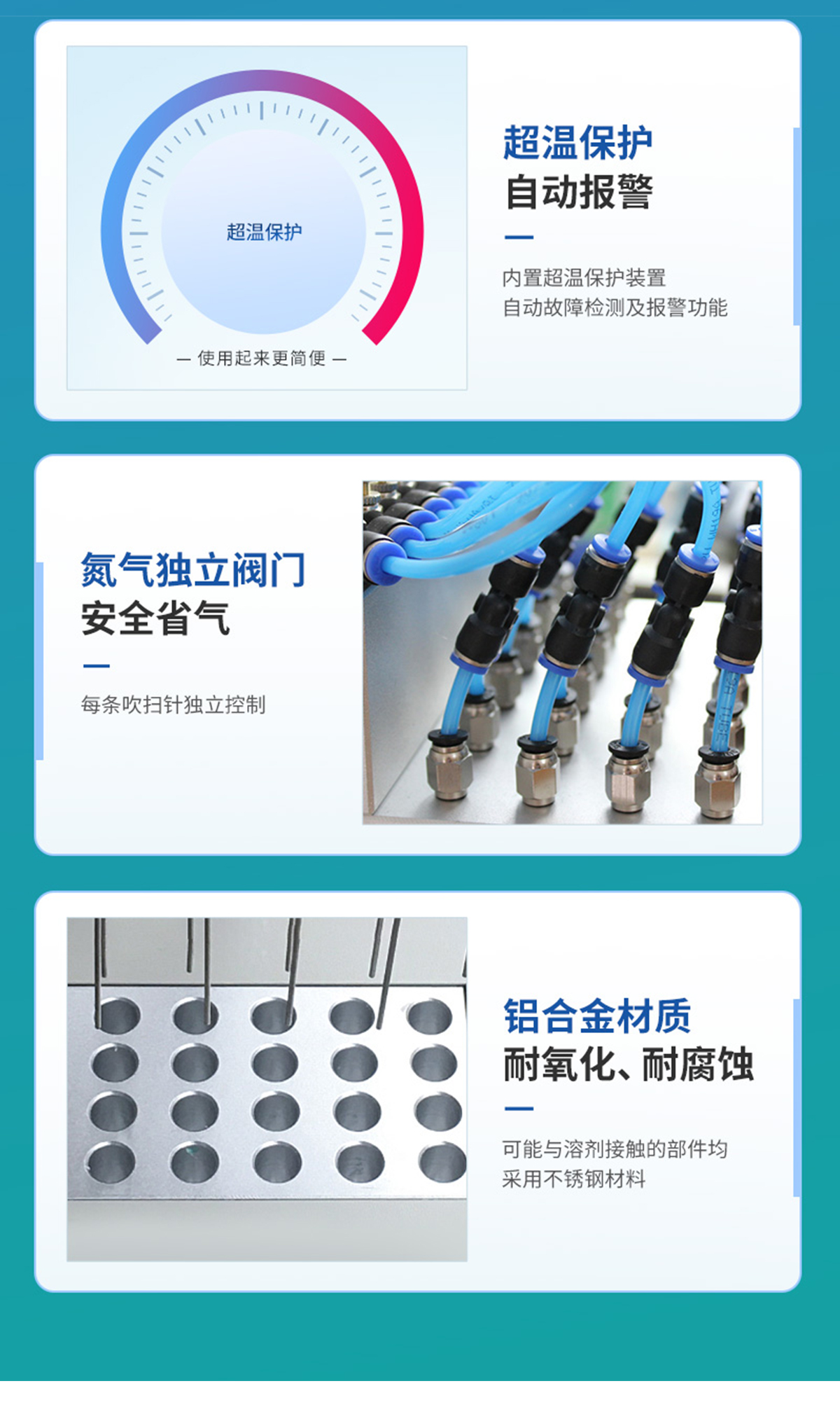 | 每個(gè)吹針都可以獨(dú)立控制,避免引起交叉污染。 | 儀器氣腔高度可以自行調(diào)節(jié),配備標(biāo)準(zhǔn)氣針長度為15厘米。 | 氮吹儀有36個(gè)氣道控制開關(guān),節(jié)約氣體,每根吹氣針的位置可獨(dú)立改變吹掃位置,使之適用不同的樣品容器及不同的樣品位置 | 在濃縮有毒溶劑時(shí),整個(gè)系統(tǒng)可置于通風(fēng)柜中,降低危險(xiǎn)。 | 內(nèi)置超溫保護(hù)裝置,自動(dòng)故障檢測及報(bào)警功能,方便實(shí)用。 | 儀器有LED顯示屏,溫度同步顯示、時(shí)間遞減顯示,可時(shí)時(shí)觀察溫度變化。 | 具有整體溫度更均勻,加熱速度快 | 本產(chǎn)品還可以作為普通的干式恒溫器使用 | 使用起來更簡便,而且溫度也可以達(dá)到150℃,可以更好濃縮樣品 |