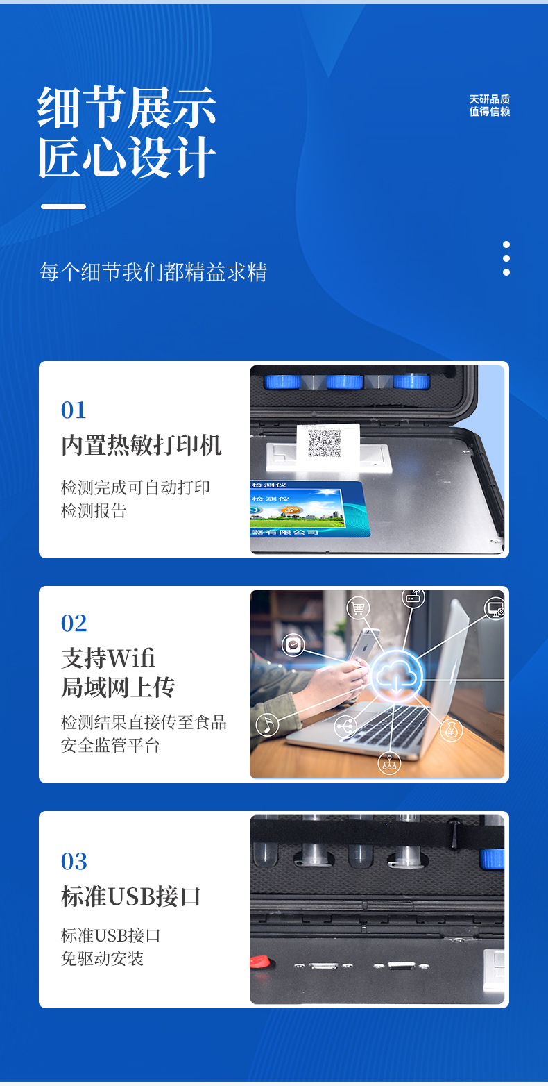 | 安卓智能操作系統(tǒng),采用更加**UI交互界面,儀器具有wifi聯(lián)網(wǎng)上傳、4G聯(lián)網(wǎng)傳輸、GPRS無(wú)線遠(yuǎn)傳、網(wǎng)線連接功能,快速批量上傳數(shù)據(jù)。 | 智能化程度高,儀器具有自檢功能:具有開(kāi)機(jī)自檢和調(diào)零功能,具有自動(dòng)檢測(cè)重復(fù)性功能。 | 新一代高速熱敏打印機(jī),檢測(cè)完成可自動(dòng)打印檢測(cè)報(bào)告和二維碼。 | 儀器帶有監(jiān)管平臺(tái),數(shù)據(jù)可局域網(wǎng)和互聯(lián)網(wǎng)數(shù)據(jù)上傳,檢測(cè)結(jié)果直接傳至食品安全監(jiān)管平臺(tái)。進(jìn)行區(qū)域食品安全監(jiān)管及大數(shù)據(jù)分析處理與數(shù)據(jù)統(tǒng)計(jì),檢測(cè)區(qū)域食品安全長(zhǎng)短期動(dòng)態(tài),達(dá)到食品安全問(wèn)題預(yù)估、預(yù)警 | 一體化便攜式快檢設(shè)備,滿足現(xiàn)場(chǎng)及流動(dòng)檢測(cè)使用需求,能夠在同一軟件下實(shí)現(xiàn)所有檢測(cè)項(xiàng)目的檢測(cè),并可通過(guò)同一窗口直觀顯示檢測(cè)結(jié)果。 | 膠體金模塊檢測(cè)方式:軌道式自動(dòng)傳輸掃描,檢測(cè)完成后自動(dòng)退出檢測(cè)卡。 | 一體化主機(jī),包含食品安全檢測(cè)模塊、多通道農(nóng)藥殘留檢測(cè)模塊、膠體金免疫層析檢測(cè)模塊。 | CT線自動(dòng)識(shí)別,無(wú)需手動(dòng)調(diào)整。 | 儀器具有品類(lèi)多種類(lèi)樣品菜單庫(kù),可靈活選擇檢測(cè)樣品,不同的檢測(cè)通道可同時(shí)檢測(cè)不同的樣品項(xiàng)目。。 | 樣品處理簡(jiǎn)單省力,整體操作快速、安全、便捷。 | 儀器具有自身保護(hù)功能,可設(shè)置用戶名及密碼,防止非工作人員操作等。 | 高靈敏度,高檢測(cè)精度,高重復(fù)性精度,掃描式高精度光學(xué)傳感器。 | 儀器具有重新校準(zhǔn)、鎖定、恢復(fù)出廠設(shè)置功能。 | 內(nèi)置強(qiáng)大的數(shù)據(jù)庫(kù),可在儀器上直接選擇樣品名稱(chēng)、檢測(cè)指標(biāo)、送檢單位等信息,也可在儀器上直接編輯錄入樣品名稱(chēng)、檢測(cè)指標(biāo)、送檢單位等信息并保存進(jìn)樣品數(shù)據(jù)庫(kù)。 | 儀器具有重新校準(zhǔn)、鎖定、恢復(fù)出廠設(shè)置功能。 | 結(jié)果判定線可修改,對(duì)照值標(biāo)定值可保存,斷電不丟失數(shù)據(jù)。 | 兼容市場(chǎng)上所有的膠體金卡,使用耗材不受限制,極大增強(qiáng)用戶使用體驗(yàn)。 |