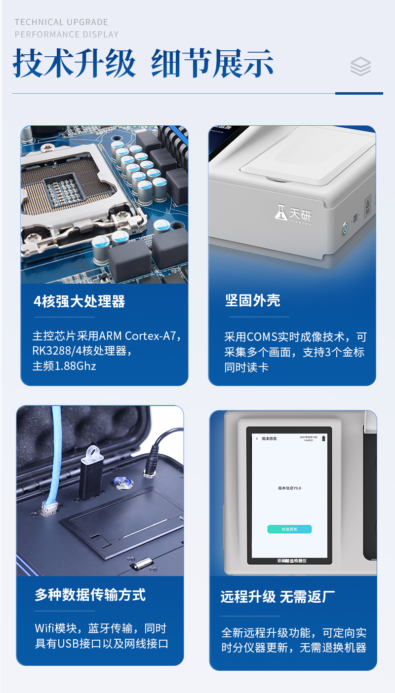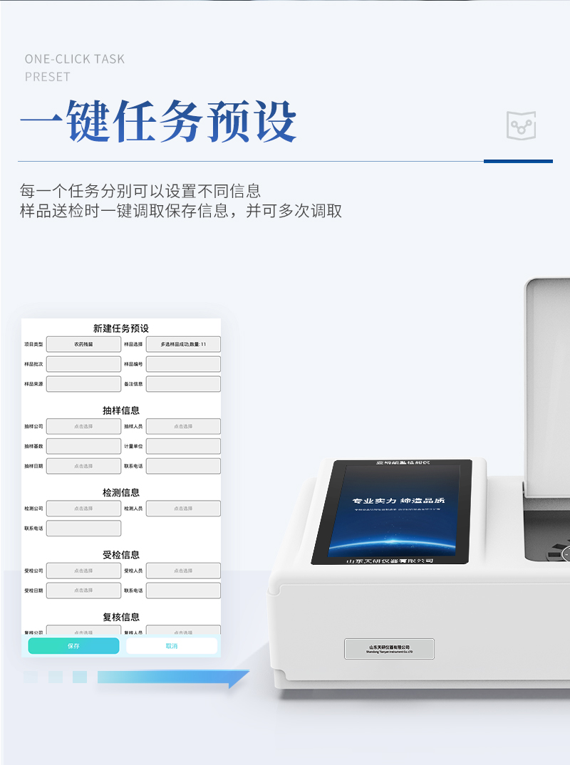 | 儀器采用臺式一體化系統(tǒng)檢測技術(shù),將分光光度模塊、數(shù)字化管理模塊、無線通訊模塊高度集成于一體,可支持檢測60種食品安全檢測項目,同時預(yù)留升級檢測方法。 | 儀器檢測模塊標(biāo)準(zhǔn)化、智能化,檢測項目可隨意自由組合。檢測箱體內(nèi)置多個標(biāo)準(zhǔn)檢測單元,檢測模塊可以調(diào)整配置。 | 顯示屏幕:儀器采用10.1英寸豎向液晶觸摸屏顯,搭配運行安卓智能操作系統(tǒng),主控芯片采用ARM Cortex-A7,RK3288/4核處理器,主頻1.88Ghz,操作方便,性能更強。 | 檢測通道:≥12通道;采用精密旋轉(zhuǎn)比色池設(shè)計,使用同芯片同光源校準(zhǔn)精度,解決不同光源之間的誤差值,更加準(zhǔn)確**。(1-12通道間誤差0.1%,**號:ZL202022821055.2) | 儀器光源:高精度進(jìn)口四波長冷光源,每個通道均配置 410、520、590、630nm 波長光源,標(biāo)配**的光路切換裝置,**光路切換功能可實現(xiàn)64波長,并且所有檢測項目可實現(xiàn)所有通道同時檢測。 | 設(shè)備可一鍵校準(zhǔn),自動保存校準(zhǔn)數(shù)據(jù),自動對比校驗,得到精準(zhǔn)光源,采用Android SP存儲數(shù)據(jù),光源數(shù)據(jù)永不丟失,方便每一次使用。 | 通訊接口:配備無線通信模塊、4G(APN)通訊模塊、藍(lán)牙傳輸,同時具有雙USB接口以及RJ45網(wǎng)線接口,可以多方式實現(xiàn)數(shù)據(jù)保存及數(shù)據(jù)傳輸。 | 存儲方式:支持U盤存儲,標(biāo)準(zhǔn)USB接口,免驅(qū)動安裝。檢測結(jié)果存儲容量20萬條以上,可生成Excel表格進(jìn)行拷貝,并具有登錄保護(hù)功能。 | 智能化操作系統(tǒng): | 1、操作系統(tǒng):儀器可在同一檢測界面自動對應(yīng)相關(guān)檢測通道,一次性選擇1-12個樣品名稱,無需退出界面,節(jié)省操作時間。并可以對每個通道屬性和樣品信息單獨進(jìn)行編輯,例如送檢單位、人員,檢測人員等,打印時勾選打印顯示。 | 2、數(shù)據(jù)集成系統(tǒng):設(shè)備首頁自動匯總分析檢測數(shù)據(jù),包含:周檢測數(shù)據(jù)、月檢測數(shù)據(jù),全部檢測總數(shù)量,均包含檢測總數(shù),合格數(shù),不合格數(shù),以及相關(guān)柱形分析圖,各項檢測數(shù)據(jù)一目了然,無需電腦查詢,更加快捷直觀。 | 3、數(shù)據(jù)庫系統(tǒng):十幾項數(shù)據(jù)庫分類管理儀器:包含項目類型、項目數(shù)據(jù)、檢測數(shù)據(jù)、歷史記錄、國標(biāo)信息、曲線信息、采樣信息、檢測信息、受檢信息、復(fù)核信息、圖表信息、光源校準(zhǔn)信息、打印樣式信息、樣品庫信息等等,數(shù)據(jù)庫之間互相協(xié)調(diào)聯(lián)動保證數(shù)據(jù)的真實完整性。同時產(chǎn)品數(shù)據(jù)庫以及歷史檢測記錄支持一鍵檢索功能。 | 4、限量規(guī)判系統(tǒng):具有限量查詢、添加物質(zhì)合規(guī)判定系統(tǒng)。檢測出結(jié)果后,系統(tǒng)自動調(diào)用系統(tǒng)數(shù)據(jù)庫中相關(guān)國標(biāo)進(jìn)行比對判定,客觀顯示判定結(jié)果是否合格。 | 5、項目預(yù)設(shè)系統(tǒng):儀器具有任務(wù)預(yù)設(shè)模塊,一鍵提前預(yù)設(shè),給出方便快捷的新檢測方案,每一個任務(wù)分別可以設(shè)置不同的樣品、批次、編號、來源、備注、抽樣信息、檢測信息、受檢信息、復(fù)核信息等更多信息。樣品送檢時一鍵調(diào)取保存信息,并可多次調(diào)取,大大提高檢測效率。 | 6、數(shù)據(jù)監(jiān)管系統(tǒng):同步對接監(jiān)管平臺,數(shù)據(jù)可局域網(wǎng)和互聯(lián)網(wǎng)數(shù)據(jù)上傳,檢測結(jié)果可選擇直接傳至食品安全監(jiān)管平臺。進(jìn)行區(qū)域食品安全監(jiān)管及大數(shù)據(jù)分析處理與數(shù)據(jù)統(tǒng)計,檢測區(qū)域食品安全長短期動態(tài),達(dá)到食品安全問題預(yù)估、預(yù)警。 | 7.1、全新打印系統(tǒng):內(nèi)置全新打印機,新創(chuàng)自定義打印方式,可按需靈活勾選控制:二維碼,抽樣信息、檢測信息,受檢信息、復(fù)核信息、抽樣日期、檢測日期等信息的打印。 | 7.2、A4紙版本報告打印功能(可選配):設(shè)備擁有兩種結(jié)果展示方式,可以自動生成A4打印模板和小票打印模板兩種樣式,可通過WiFi及網(wǎng)線等方式鏈接外置打印機可進(jìn)行打印。 | 8.供電模式:儀器交直流兩用,直流12V供電,可連接車載電源,可配6ah大容量充電鋰電池,電量可實時顯示,方便戶外流動測試。 | 9.儀器具備遠(yuǎn)程升級功能,可定向分客戶分儀器更新,開機后自動更新,并可持續(xù)性免費更新系統(tǒng)版本,無需像傳統(tǒng)產(chǎn)品返廠更新,節(jié)省時間及人力成本并避免了物流運輸返廠升級導(dǎo)致設(shè)備損壞的潛在風(fēng)險。 |