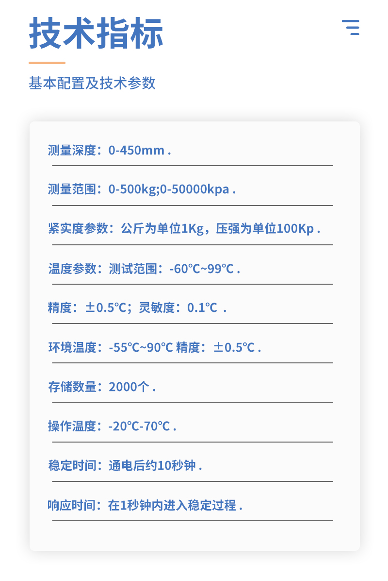 | 顯示屏:2.4英寸彩色TFT液晶 | 接口:電源接頭:5.5*2.5/2.1;USB接口:連接電腦;航空插頭:RS485 | 存儲(chǔ):大容量FLASH存儲(chǔ)器;可存儲(chǔ)10萬條數(shù)據(jù);自動(dòng)存儲(chǔ):1S~180S可調(diào) | 定位:GPS | GSM上傳:GPRS/2G/4G | 電池:12V 2500mah鋰電池;工作時(shí)間:10H;充電時(shí)間:3H | 導(dǎo)出:USB線連接電腦上位機(jī),導(dǎo)出Excel表格 | 單位:kg/cm2;LB;N/cm2;Kpa | 土壤緊實(shí)度傳感器: | 量程:0~100kg | 靈敏度:2.0±0.1mv/V | 綜合精度:0.1%F?S | 重復(fù)性:±0.05%F?S | 工作溫度:-20~﹢70℃ | 探針材質(zhì):不銹鋼 | 輸入阻抗:735 ±35Ω | 輸出阻抗:700±3Ω | 非線性:±0.05 %F?S | 密封等級(jí):IP66 | 激勵(lì)電壓:5~12 VDC | 線纜:φ3×2000mm |