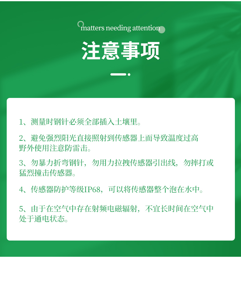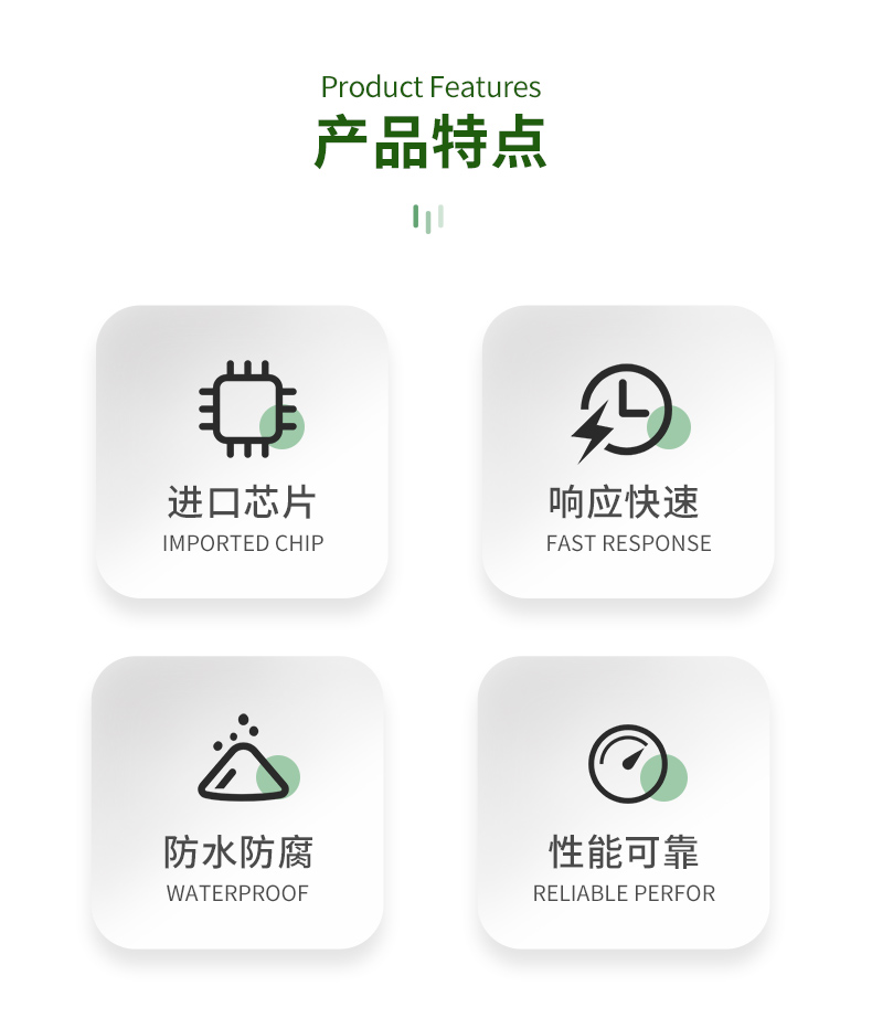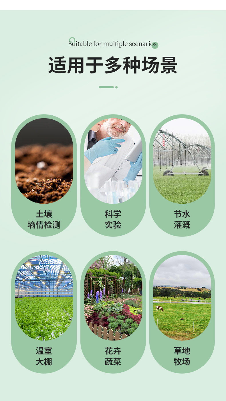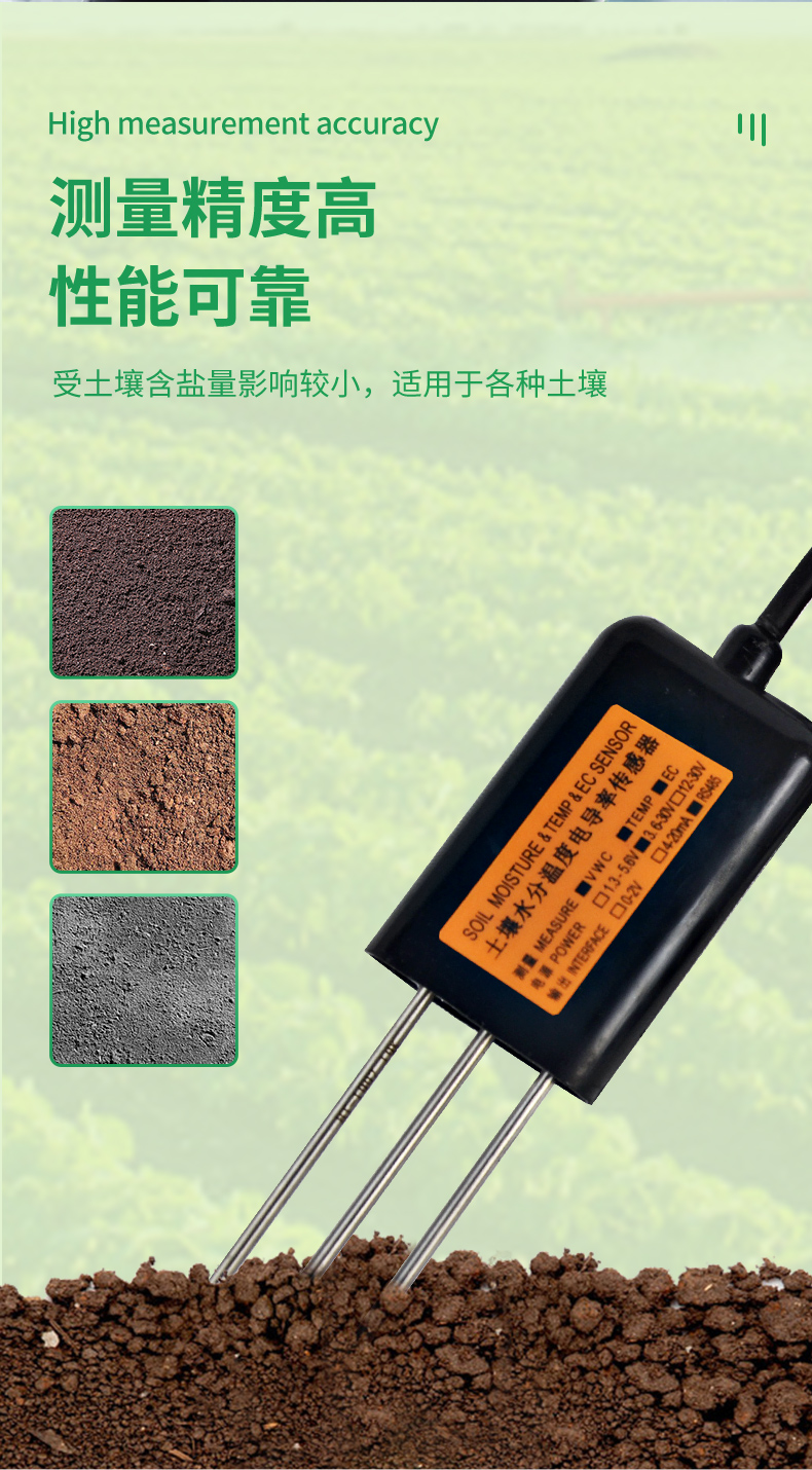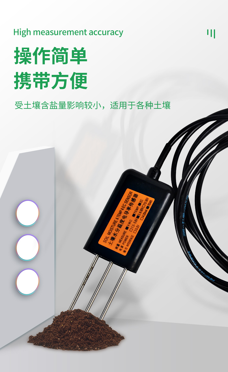 | (1)土壤含水率、電導(dǎo)率以及溫度三參數(shù)合一。 | (2)也可用于水肥一體溶液、以及其他營(yíng)養(yǎng)液與基質(zhì)的電導(dǎo)率。 | (3)電極采用特殊處理的合金材料,可承受較強(qiáng)的外力沖擊,不易損壞。 | (4)完全密封,耐酸堿腐蝕,可埋入土壤或直接投入水中進(jìn)行長(zhǎng)期動(dòng)態(tài)檢測(cè)。 | (5)精度高,響應(yīng)快,互換性好,探針插入式設(shè)計(jì)保證測(cè)量**,性能可靠。 | (6)完善的保護(hù)電路與多種信號(hào)輸出接口可選。 |