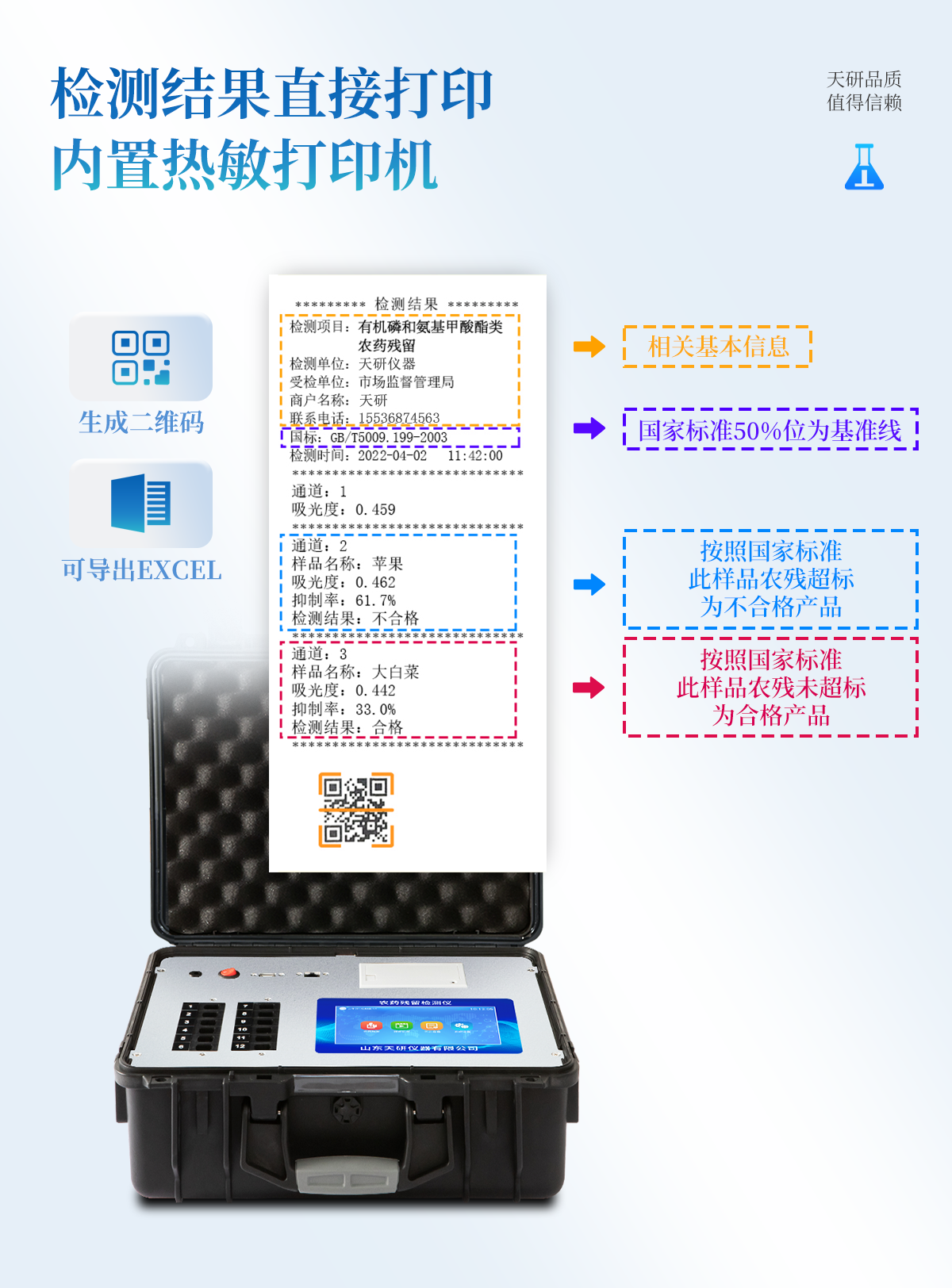 檢測標(biāo)準(zhǔn):依據(jù)國家標(biāo)準(zhǔn)方法(GB/T5009.199-2003)以及世界衛(wèi)生組織WHO、世界糧農(nóng)組織FAO殘留農(nóng)藥檢測標(biāo)準(zhǔn)、世界環(huán)境保護(hù)局EPA參照攝入量等要求來設(shè)計。采用酶抑制率比色法對水果、蔬菜等農(nóng)林產(chǎn)品中有機(jī)磷和氨基甲酸酯類農(nóng)藥含量進(jìn)行快速準(zhǔn)確的檢測,乙酰膽堿酯酶和丁酰膽堿酯酶試劑均可以使用,符合國家標(biāo)準(zhǔn)和農(nóng)業(yè)部標(biāo)準(zhǔn)的要求。
