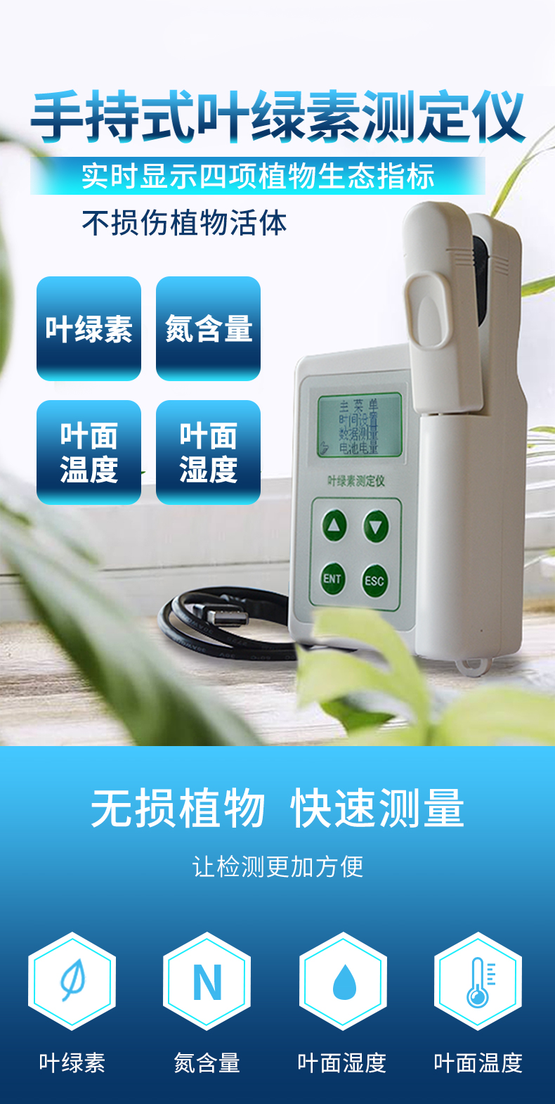 氮素含量一般情況下直接反應(yīng)作物的健康情況,生長狀態(tài)、了解植物真實(shí)的硝基需求量和土壤硝基的缺乏程度或是否過多地施加了氮肥,廣泛應(yīng)用于氮肥管理,除草劑應(yīng)用,葉片衰老,環(huán)境脅迫等研究,葉綠素測量儀在農(nóng)業(yè)種植過程中有很大的意義。 葉 綠素含量的測定結(jié)果是SPAD值,是葉片在兩種波長650nm 和940nm,葉片傳輸光的數(shù)量進(jìn)行比值計(jì)算,來確定葉片當(dāng)前葉綠素的相對數(shù)量(兩種波長范圍內(nèi)的透光系數(shù)來確定葉片當(dāng)前葉綠素的相對數(shù)量 ),SPAD值與葉綠素之間成正比關(guān)系,因此SPAD值往往間接地可代表葉綠素值,從而可以評估植物健康狀況、生長狀態(tài),因而在農(nóng)業(yè)中,時常使用葉綠素計(jì) 來進(jìn)行對植物葉綠素含量進(jìn)行檢測,以此來進(jìn)行指導(dǎo)氮肥的施用量,因而在農(nóng)業(yè)種植過程中使用葉綠素計(jì)來進(jìn)行指導(dǎo)氮元素含量的施肥,同時在很多植物中,以此來 進(jìn)行判斷植物的抗逆性。 葉溫常用來表示植物的體溫狀況,植物葉片中所有的化學(xué)反應(yīng),都受葉片溫度的影響,在植物生理活動的分析中經(jīng)常用到。葉溫與 氣溫的差值,可以表明植物的缺水情況或受旱程度。因?yàn)楫?dāng)水分供應(yīng)充足時,植物蒸騰正常,蒸騰耗熱可以降低植物體溫,這時葉溫比氣溫低;反之受旱時,植物體 溫上升,可高于當(dāng)時的氣溫。
