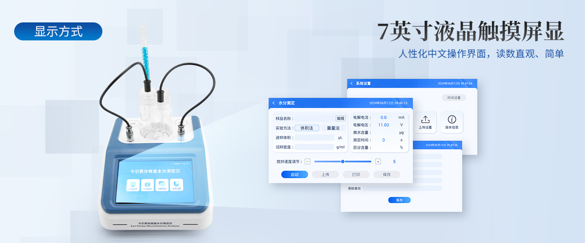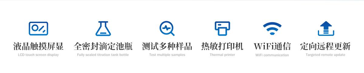 | 1.儀器主控芯片采用ARM Cortex-A7,RK3288/4核處理器,主頻1.88Ghz,運(yùn)轉(zhuǎn)速度更快速,穩(wěn)定性更強(qiáng)。 | 2.顯示方式:7英寸液晶觸摸屏顯示,人性化中文操作界面,讀數(shù)直觀、簡(jiǎn)單。 | 3.儀器采用全密封滴定池瓶,避免試劑與人接觸,杜絕環(huán)境濕度對(duì)檢測(cè)的影響;檢測(cè)過(guò)程中儀器自動(dòng)控制,攪拌、測(cè)定60秒左右完成,可直接顯示測(cè)定結(jié)果,無(wú)需人員頻繁操作。 | 4.儀器內(nèi)置操作視頻,可直接觀看學(xué)習(xí)操作方法。 | 5.儀器可以測(cè)試多種樣品,循環(huán)檢測(cè),即放即檢。 | 6.儀器可對(duì)樣品信息自由編輯,包括:樣品名稱(chēng)、樣品編號(hào)、檢測(cè)單位、檢測(cè)人員、聯(lián)系方式、受檢單位等。 | 7.儀器可對(duì)檢測(cè)樣品測(cè)定信息進(jìn)行設(shè)置,例如:電解電流、電解電壓、微量水分含量、測(cè)定時(shí)間、百分含量、進(jìn)樣體積、試樣密度、毛重和皮重等。 | 8.水分檢測(cè)方式可根據(jù)實(shí)際需求選擇體積法或重量法。 | 9.內(nèi)置熱敏打印機(jī),可直接打印檢測(cè)結(jié)果,并可根據(jù)需求靈活設(shè)置打印內(nèi)容(二維碼,樣品編號(hào)、檢測(cè)單位、檢測(cè)人員、聯(lián)系電話、受檢單位、檢測(cè)日期等)。 | 10.樣品檢測(cè)結(jié)果可通過(guò)二維碼掃碼查看。 | 11.檢測(cè)數(shù)據(jù)可通過(guò)歷史記錄進(jìn)行檢索,通過(guò)設(shè)置檢測(cè)日期、樣品編號(hào)、檢測(cè)單位、檢測(cè)人員、樣品名稱(chēng)、受檢單位等信息查找對(duì)應(yīng)數(shù)據(jù)。 | 12.儀器配備標(biāo)準(zhǔn)USB接口,免驅(qū)動(dòng)安裝。檢測(cè)結(jié)果存儲(chǔ)容量20萬(wàn)條以上,可生成Excel表格進(jìn)行拷貝。 | 13.儀器配備WiFi通信模塊,可上傳數(shù)據(jù)至云平臺(tái),實(shí)現(xiàn)電腦端數(shù)據(jù)查詢、瀏覽、分析、統(tǒng)計(jì)等。 | 14.儀器可定向遠(yuǎn)程更新,進(jìn)行升級(jí)維護(hù),無(wú)需返廠更新,節(jié)省時(shí)間及人力成本,避免了物流運(yùn)輸導(dǎo)致設(shè)備損壞的潛在風(fēng)險(xiǎn)。 |