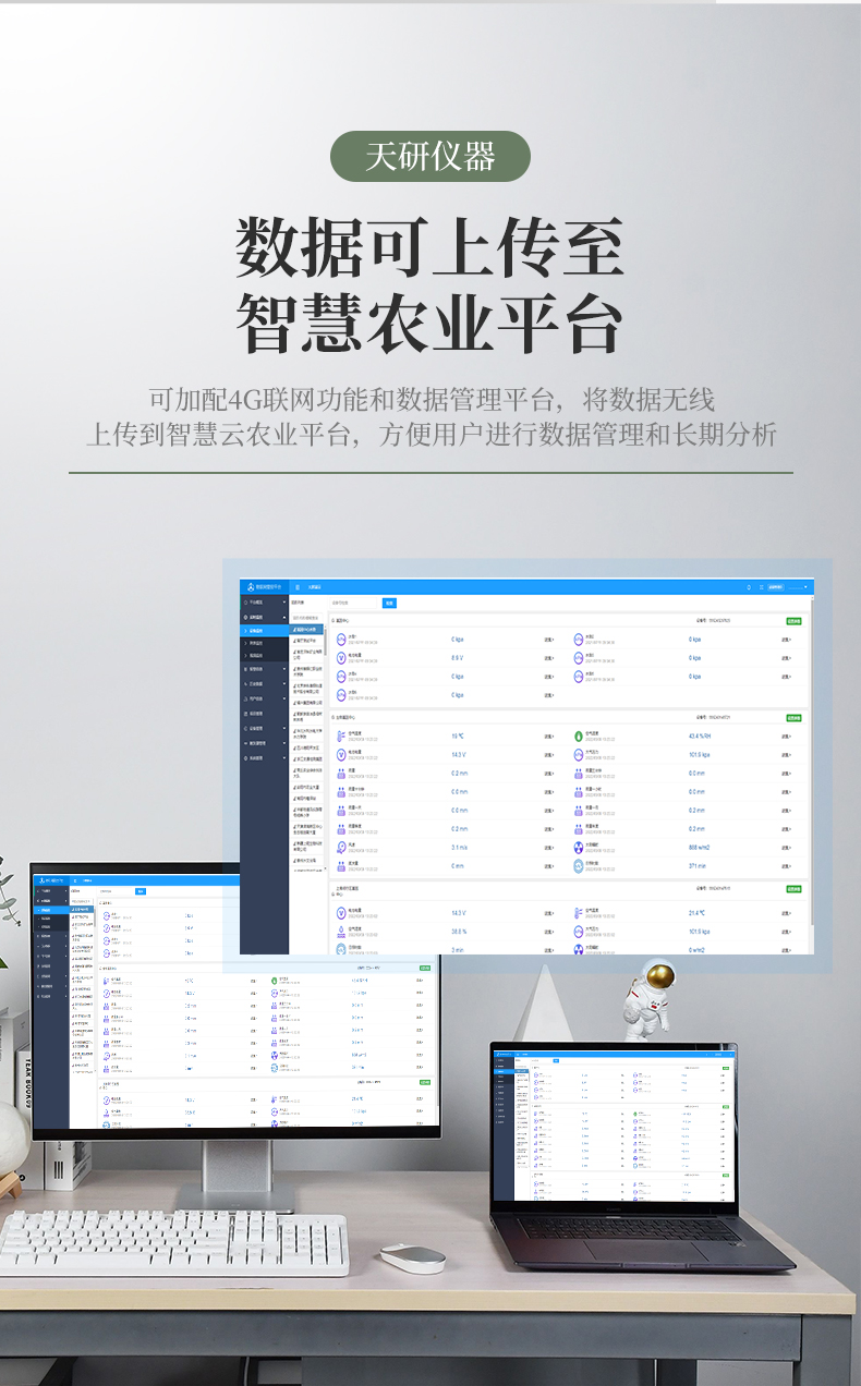 | 儀器可加配4G聯(lián)網(wǎng)功和能數(shù)據(jù)管理平臺(tái),將本機(jī)存儲(chǔ)的被測(cè)點(diǎn)環(huán)境因子測(cè)量歷史數(shù)據(jù)無(wú)線上傳到智慧云農(nóng)業(yè)平臺(tái),方便用戶進(jìn)行數(shù)據(jù)管理和長(zhǎng)期分析。 | 本機(jī)體積小巧、美觀,操作簡(jiǎn)單方便,性能可靠,野外攜帶極為方便。主機(jī)連接傳感器后可以手動(dòng)存儲(chǔ)記錄也可通過主機(jī)任意設(shè)置采樣間隔,自動(dòng)存儲(chǔ)記錄數(shù)據(jù)。 | 大屏幕彩色液晶顯示屏,全程跟蹤記錄各個(gè)被測(cè)環(huán)境因子的數(shù)值、組數(shù)、低電壓示警,主機(jī)內(nèi)置大容量存儲(chǔ)器,可儲(chǔ)存三十萬(wàn)條數(shù)據(jù),具有斷電數(shù)據(jù)自動(dòng)存儲(chǔ)保護(hù)功能。 | 各個(gè)傳感器插入主機(jī)后,主機(jī)具有自動(dòng)識(shí)別功能,傳感器一致性好,可按需求自行組合傳感器,不同參數(shù)的傳感器接口可以互相轉(zhuǎn)換,對(duì)測(cè)量精度沒有影響。 | 儀器具有多通道自動(dòng)檢測(cè)擴(kuò)展功能,可以實(shí)現(xiàn)多個(gè)傳感器同時(shí)接入的同步檢測(cè)。 | 上位機(jī)軟件功能強(qiáng)大,隨時(shí)可以通過USB接口將記錄中的數(shù)據(jù)導(dǎo)出到計(jì)算機(jī)上,并可以存儲(chǔ)為EXCE表格文件,生成數(shù)據(jù)曲線,以供其它分析軟件進(jìn)一步進(jìn)行數(shù)據(jù)處理。具有設(shè)置超限區(qū)域著色功能,超限數(shù)據(jù)變色預(yù)警,可作為環(huán)境評(píng)價(jià)的一個(gè)依據(jù)。 |