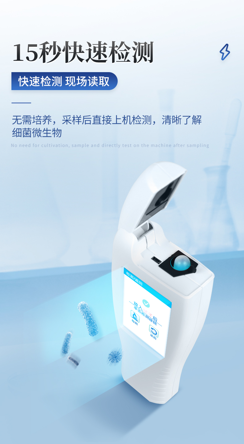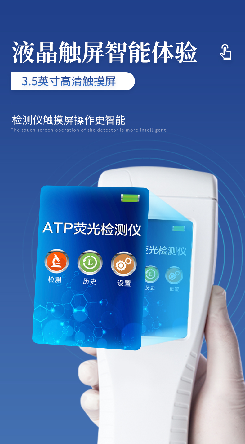 該設(shè)備為全新升級(jí)產(chǎn)品,大屏幕觸摸顯示屏,代替?zhèn)鹘y(tǒng)按鍵。操作采用生物化學(xué)反應(yīng)方法檢測(cè)ATP含量,ATP熒光檢測(cè)儀基于螢火蟲發(fā)光原理,利用“熒光素酶—熒光素體系”快速檢測(cè)三磷酸腺苷(ATP)。ATP拭子含有可以裂解細(xì)胞膜的試劑,能將細(xì)胞內(nèi)ATP釋放出來(lái),與試劑中含有的特異性酶發(fā)生反應(yīng),產(chǎn)生光,再用熒光照度計(jì)檢測(cè)發(fā)光值,微生物的數(shù)量與發(fā)光值成正比,由于所有生物活細(xì)胞中含有恒量的ATP,所以ATP含量可以清晰地表明樣品中微生物與其他生物殘余的多少,用于判斷衛(wèi)生狀況。