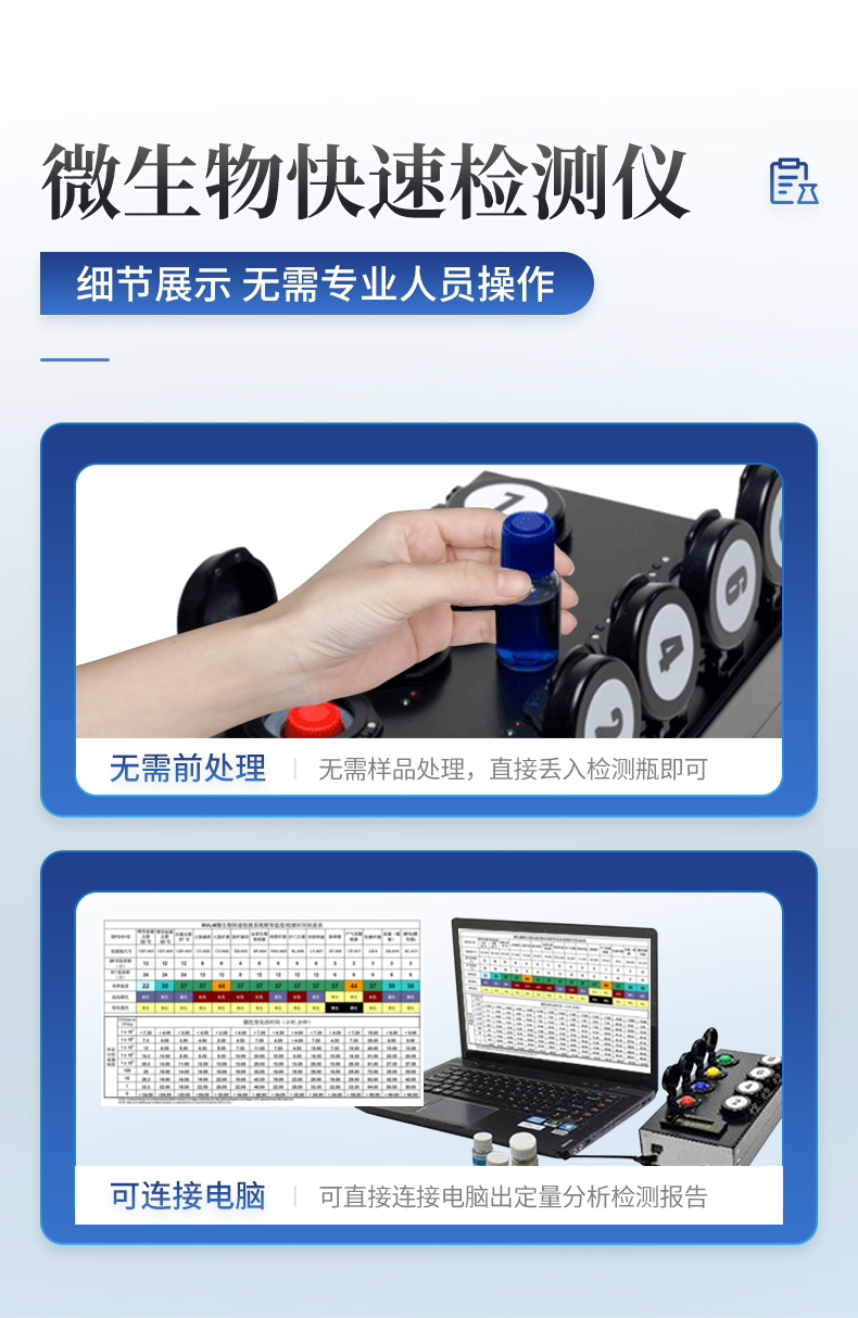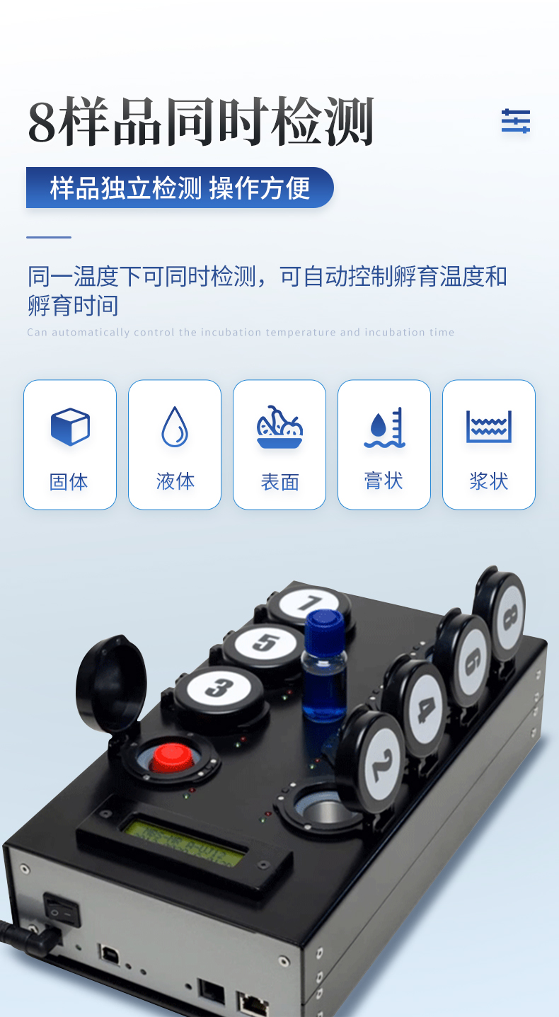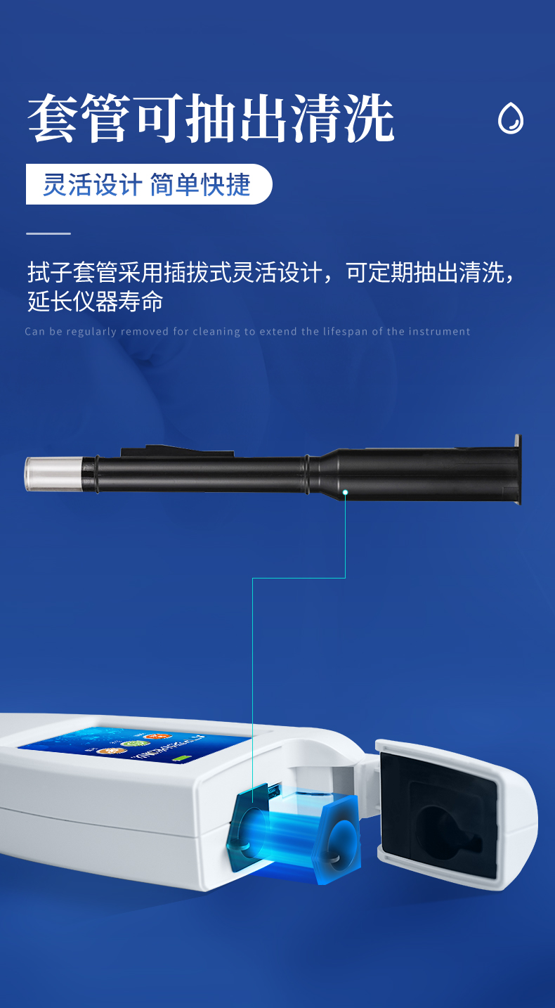 | 實(shí)用性 —— 可根據(jù)環(huán)境檢測(cè)需求設(shè)定上下限值,做到數(shù)據(jù)快速評(píng)估預(yù)警,表面潔凈度快速篩查。 | 靈敏度高 —— *************** | 速度快 —— 常規(guī)培養(yǎng)法18-24h以上,而ATP只需要十幾秒鐘 . | 可行性 —— 微生物數(shù)量與微生物體內(nèi)所含ATP有明確的相關(guān)性。 通過檢測(cè)ATP含量,可間接得出反應(yīng)中微生物數(shù)量 | 可操作性 —— 傳統(tǒng)培養(yǎng)方法需要在實(shí)驗(yàn)室由經(jīng)過培訓(xùn)的技術(shù)人員進(jìn)行操作;而ATP快速潔凈度檢測(cè)操作非常簡(jiǎn)便,只需簡(jiǎn)單的培訓(xùn)即可由一般工作人員進(jìn)行現(xiàn)場(chǎng)操作。 | 體驗(yàn)更好 —— 試子套管采用插拔式靈活設(shè)計(jì),可定期清洗長(zhǎng)期使用,延長(zhǎng)儀器壽命。 |