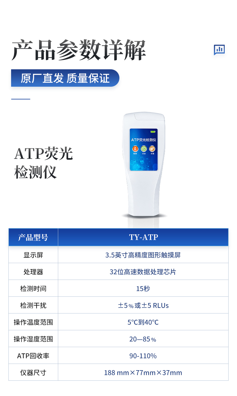 產(chǎn)品描述:產(chǎn)品簡(jiǎn)介: 該設(shè)備為全新升級(jí)產(chǎn)品,大屏幕觸摸顯示屏,代替?zhèn)鹘y(tǒng)按鍵。操作采用生物化學(xué)反應(yīng)方法檢測(cè)ATP含量,ATP熒光檢測(cè)儀基于螢火蟲發(fā)光原理,利用“熒光素酶—熒光素體系”快速檢測(cè)三磷酸腺苷(ATP)。ATP拭子含有可以裂解細(xì)胞膜的試劑,能將細(xì)胞內(nèi)ATP釋放出來(lái),與試劑中含有的特異性酶發(fā)生反應(yīng),產(chǎn)生光,再【詳情】