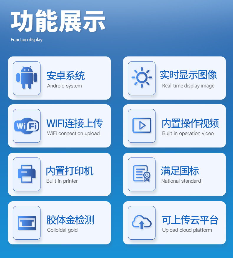 | 安卓智能操作系統(tǒng),采用更加**UI交互界面,儀器具有wifi聯(lián)網(wǎng)上傳、4G聯(lián)網(wǎng)傳輸、GPRS無線遠(yuǎn)傳、網(wǎng)線連接功能,快速批量上傳數(shù)據(jù)。 | 智能化程度高,儀器具有自檢功能:具有開機(jī)自檢和調(diào)零功能,具有自動檢測重復(fù)性功能。 | 新一代高速熱敏打印機(jī),檢測完成可自動打印檢測報告和二維碼。 | 儀器帶有監(jiān)管平臺,數(shù)據(jù)可局域網(wǎng)和互聯(lián)網(wǎng)數(shù)據(jù)上傳,檢測結(jié)果直接傳至食品安全監(jiān)管平臺。進(jìn)行區(qū)域食品安全監(jiān)管及大數(shù)據(jù)分析處理與數(shù)據(jù)統(tǒng)計,檢測區(qū)域食品安全長短期動態(tài),達(dá)到食品安全問題預(yù)估、預(yù)警 | 一體化便攜式快檢設(shè)備,滿足現(xiàn)場及流動檢測使用需求,能夠在同一軟件下實現(xiàn)所有檢測項目的檢測,并可通過同一窗口直觀顯示檢測結(jié)果。 | 膠體金模塊檢測方式:軌道式自動傳輸掃描,檢測完成后自動退出檢測卡。 | 一體化主機(jī),包含食品安全檢測模塊、多通道農(nóng)藥殘留檢測模塊、膠體金免疫層析檢測模塊。 | CT線自動識別,無需手動調(diào)整。 | 儀器具有品類多種類樣品菜單庫,可靈活選擇檢測樣品,不同的檢測通道可同時檢測不同的樣品項目。。 | 樣品處理簡單省力,整體操作快速、安全、便捷。 | 儀器具有自身保護(hù)功能,可設(shè)置用戶名及密碼,防止非工作人員操作等。 | 高靈敏度,高檢測精度,高重復(fù)性精度,掃描式高精度光學(xué)傳感器。 | 儀器具有重新校準(zhǔn)、鎖定、恢復(fù)出廠設(shè)置功能。 | 內(nèi)置強(qiáng)大的數(shù)據(jù)庫,可在儀器上直接選擇樣品名稱、檢測指標(biāo)、送檢單位等信息,也可在儀器上直接編輯錄入樣品名稱、檢測指標(biāo)、送檢單位等信息并保存進(jìn)樣品數(shù)據(jù)庫。 | 儀器具有重新校準(zhǔn)、鎖定、恢復(fù)出廠設(shè)置功能。 | 結(jié)果判定線可修改,對照值標(biāo)定值可保存,斷電不丟失數(shù)據(jù)。 | 兼容市場上所有的膠體金卡,使用耗材不受限制,極大增強(qiáng)用戶使用體驗。 |