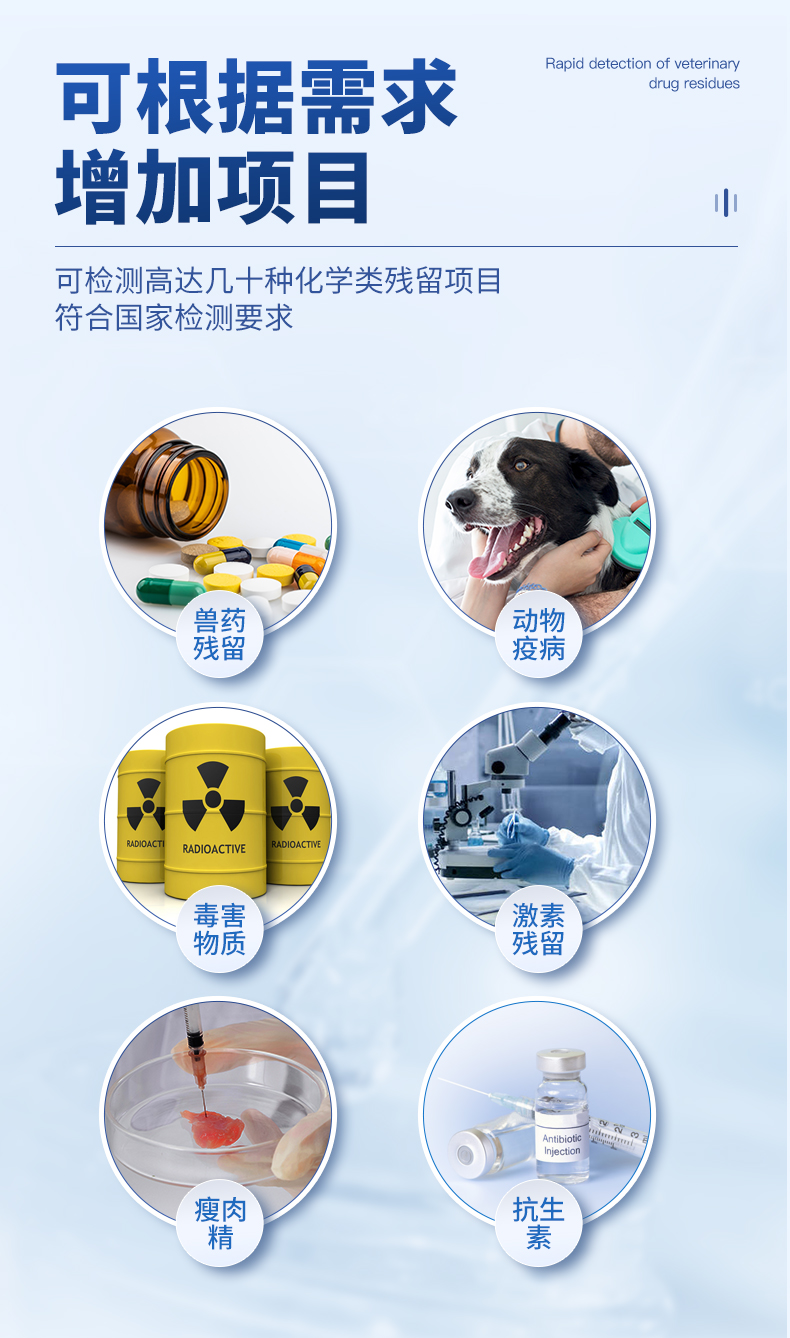 | 瘦肉精激素類(獸藥):鹽酸克倫特羅、沙丁胺醇、萊克多巴胺、己烯雌酚、喹乙醇等 | 抗生素殘留類(獸藥):四環(huán)素類、硝基呋喃類、磺胺類、沙星類、喹諾酮類、慶大霉素、鏈霉素、阿莫西林、紅霉素等 | 水產(chǎn)品安全類:孔雀石綠、氯霉素、呋喃妥因代謝、呋喃西林代謝、呋喃它酮代謝、呋喃唑酮代謝等 | 以及病害肉及肉類新鮮度的擴(kuò)展檢測。 |